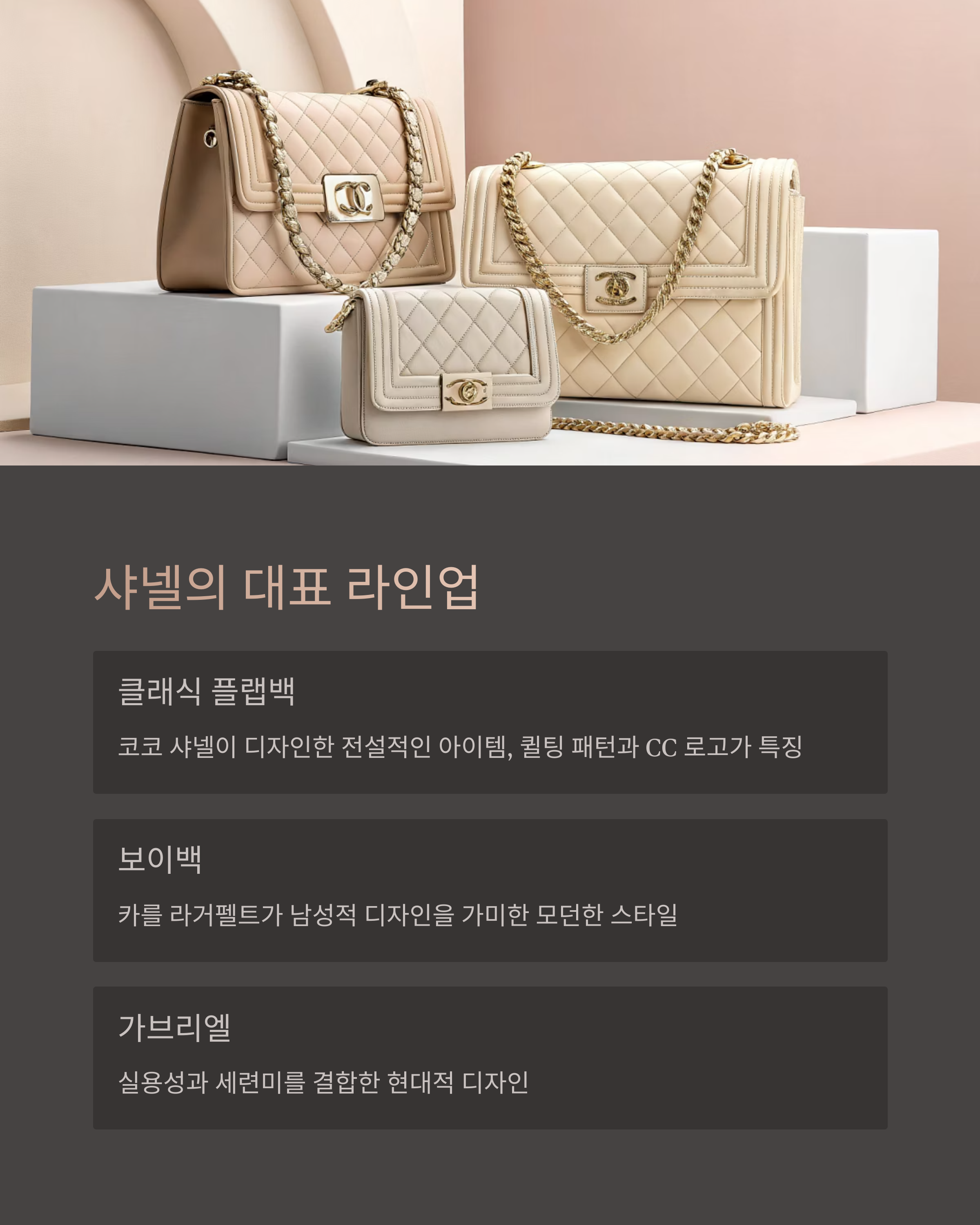 클래식 플랩백, 보이백, 가브리엘 백, 코코 핸들, 22백이 대표적인 인기 라인입니다.