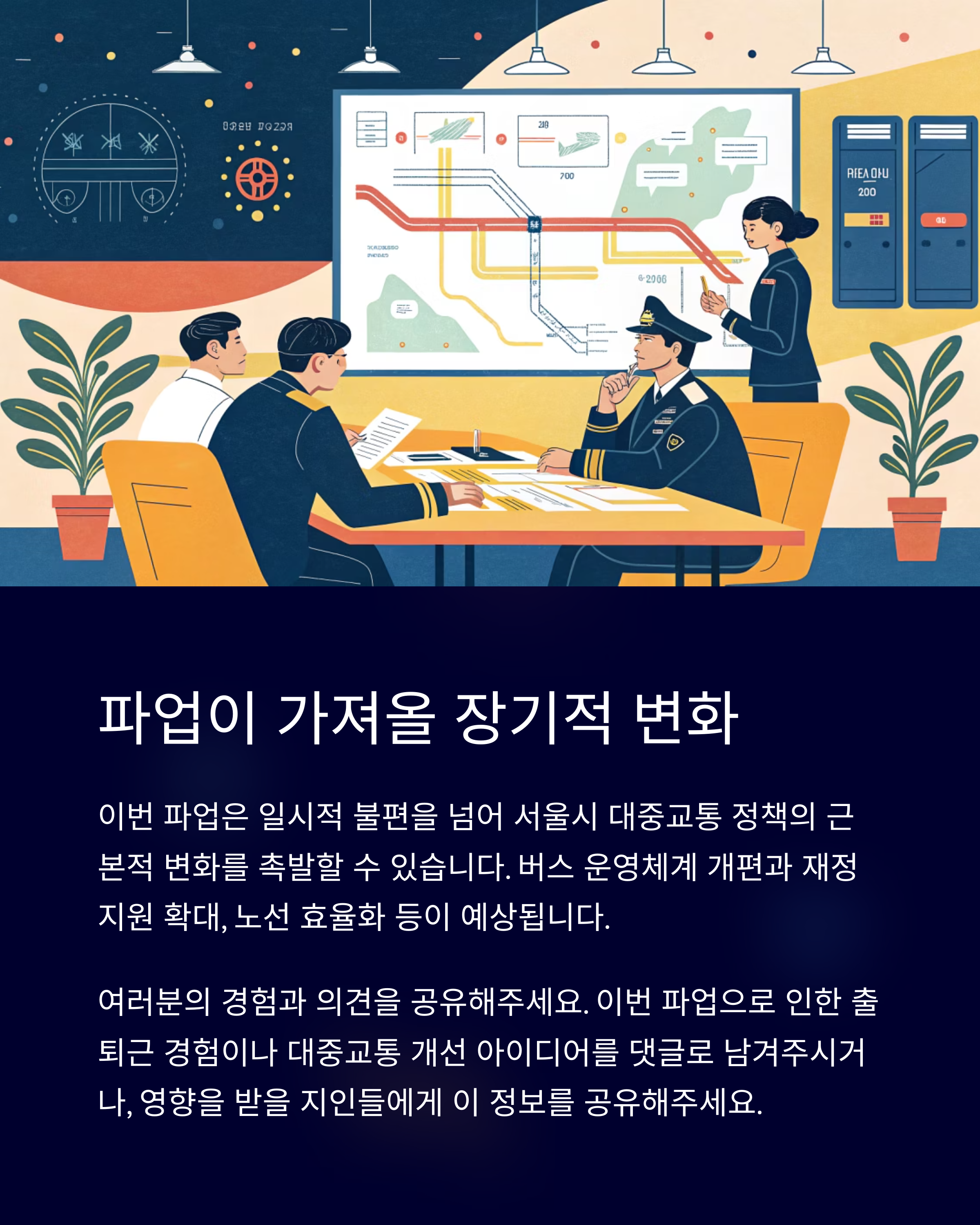 이번 버스 파업 위기는 단순한 통상임금 문제가 아니라, 대중교통 운영 구조 자체에 대한 근본적 논의로 이어질 가능성도 있습니다. 앞으로 예상되는 변화는 다음과 같습니다: