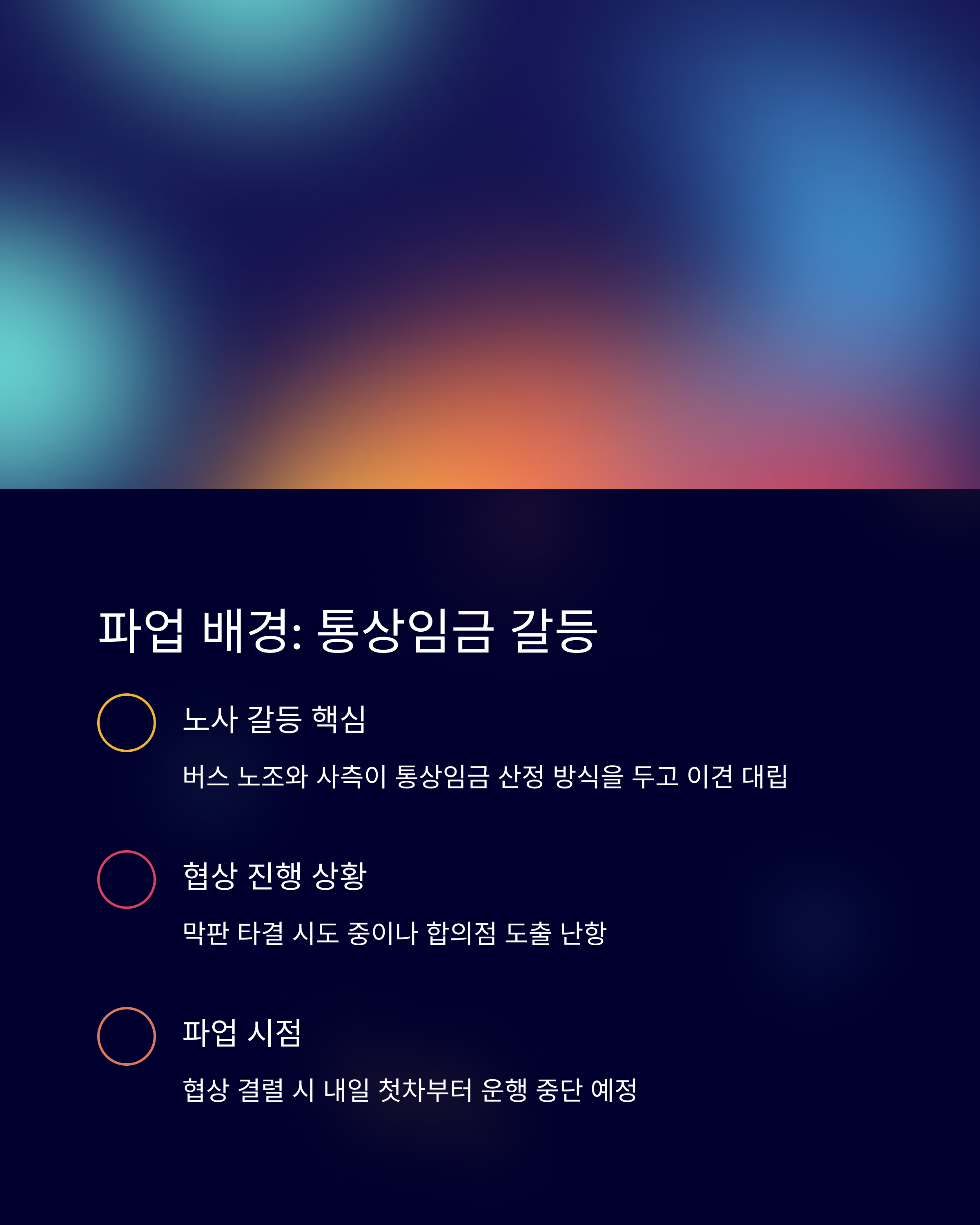 2025년 4월 29일 밤, 서울 시내버스 노사는 통상임금을 둘러싼 협상의 마지막 라운드에 돌입했습니다. 만약 오늘 밤 타결되지 않으면, 내일 새벽 첫차부터 서울 시내 7,400여 대 버스 운행이 전면 중단될 수 있습니다. 이는 코로나 이후 최대 규모의 대중교통 마비 사태가 될 수 있어, 서울시 전체가 초긴장 상태에 돌입했습니다.