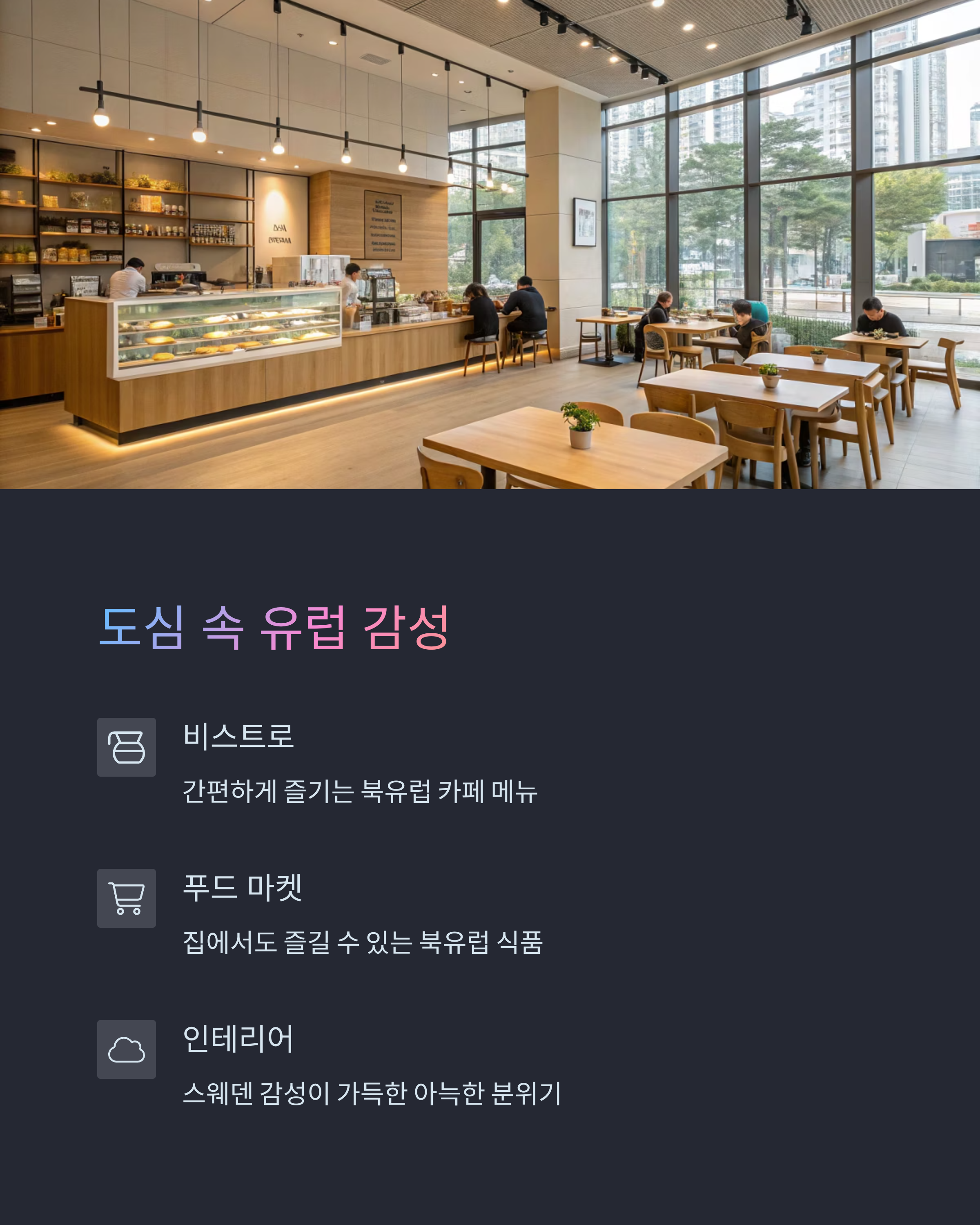 1층 출구 쪽에 있는 비스트로는 빠르고 간편하게 북유럽 스낵을 즐길 수 있는 공간이에요. 가장 인기 있는 메뉴는 단연 핫도그와 소프트아이스크림 조합! 아래 표는 제가 직접 먹어본 베스트 5 메뉴입니다.