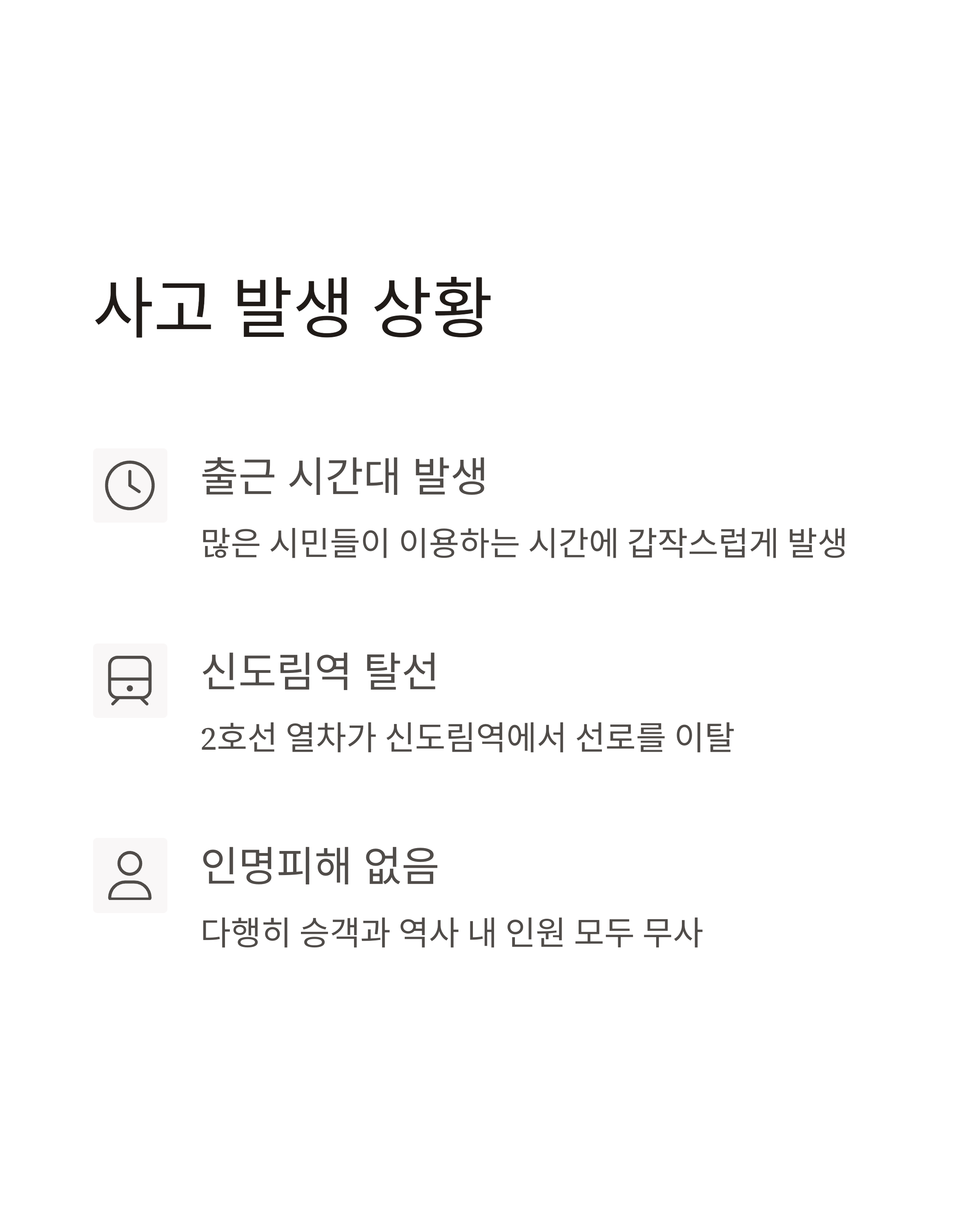 서울교통공사에 따르면 사고는 오전 8시 41분경 발생했으며, 사고 직후 홍대입구역에서 서울대입구역 사이 구간의 열차 운행이 전면 중단되었습니다. 해당 시간대는 통근객이 가장 많은 골든타임이었기 때문에, 시민 불편이 극심했습니다.