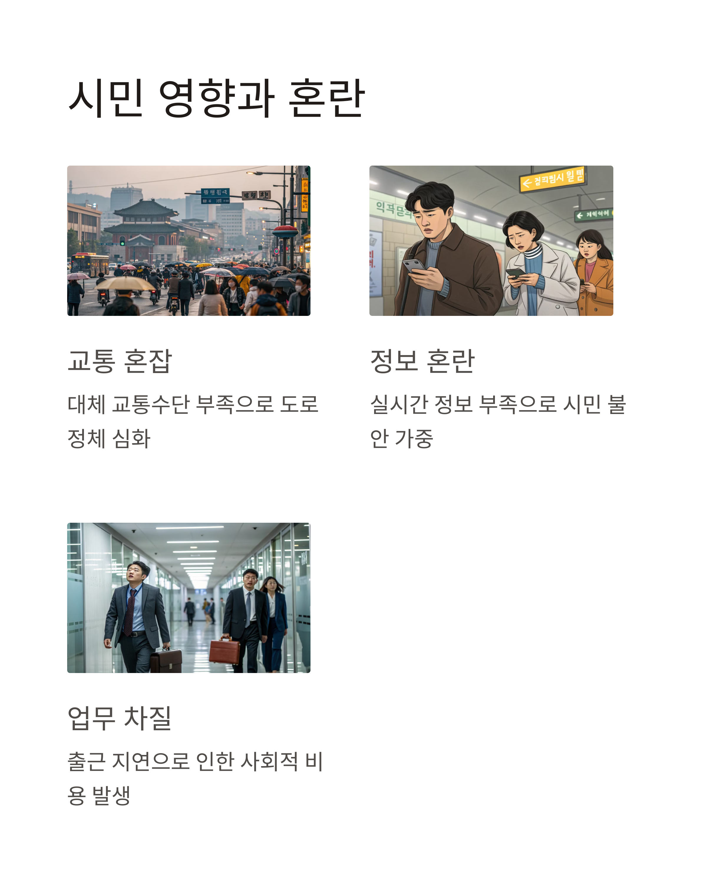 서울교통공사는 지상 버스 증편 및 안내 인력을 배치해 시민의 이동을 도왔습니다.