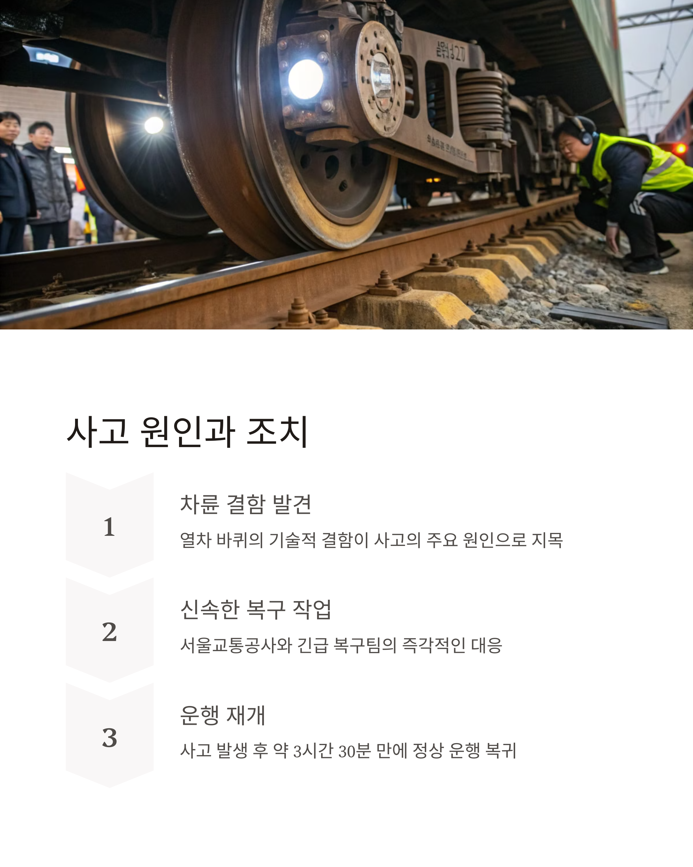 서울교통공사에 따르면 이번 탈선 사고의 직접적인 원인은 차륜(바퀴) 문제로 추정되고 있습니다. 정밀 진단 결과, 해당 열차의 바퀴 일부가 손상되어 선로와의 접지력이 비정상적으로 작동했고, 이로 인해 탈선 현상이 발생했다고 밝혔죠. 특히 이 바퀴는 정기 점검 직전 상태였기 때문에, 관리 체계의 허점 또한 지적받고 있어요. 해당 차량은 출고 후 일정 주행 거리를 넘기며 진동이 커졌다는 보고가 있었지만, 이에 대한 선제적 조치가 이뤄지지 않은 것도 큰 문제로 떠오르고 있습니다.