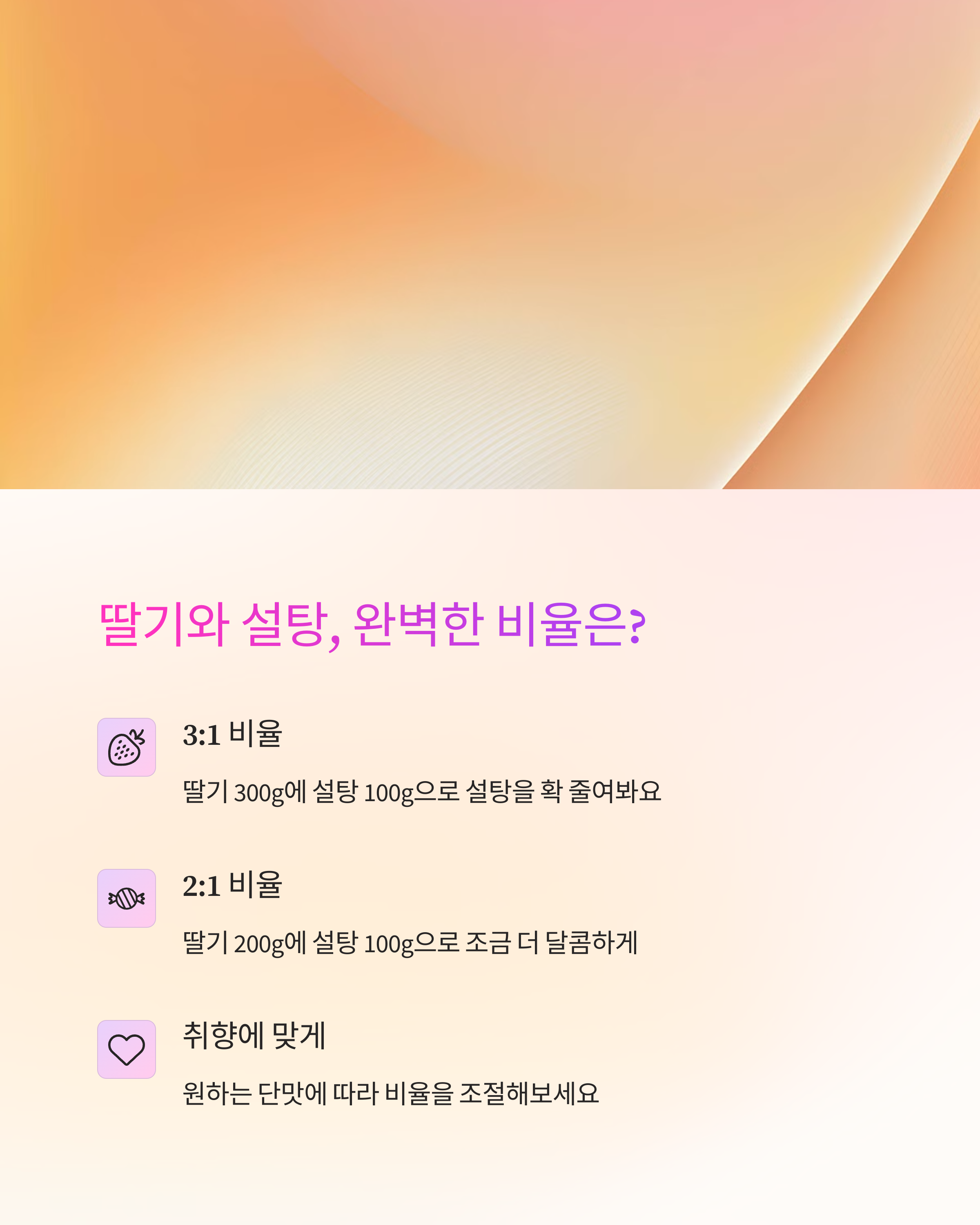 설탕은 맛을 내고 보존성을 높여주는 중요한 재료이긴 해요. 하지만 과하게 섭취하면 건강에 좋지 않다는 거, 다들 아시죠? 특히 가정에서 만드는 잼은 아이들도 자주 먹게 되니까 설탕 함량을 조절해 주는 게 중요해요. 또 설탕을 줄이면 딸기 본연의 상큼함과 과일의 깊은 맛이 살아나서 더 자연스러운 맛을 느낄 수 있어요. 당도가 낮은 만큼 식감이 더 부드럽고 깔끔하다는 장점도 있답니다.