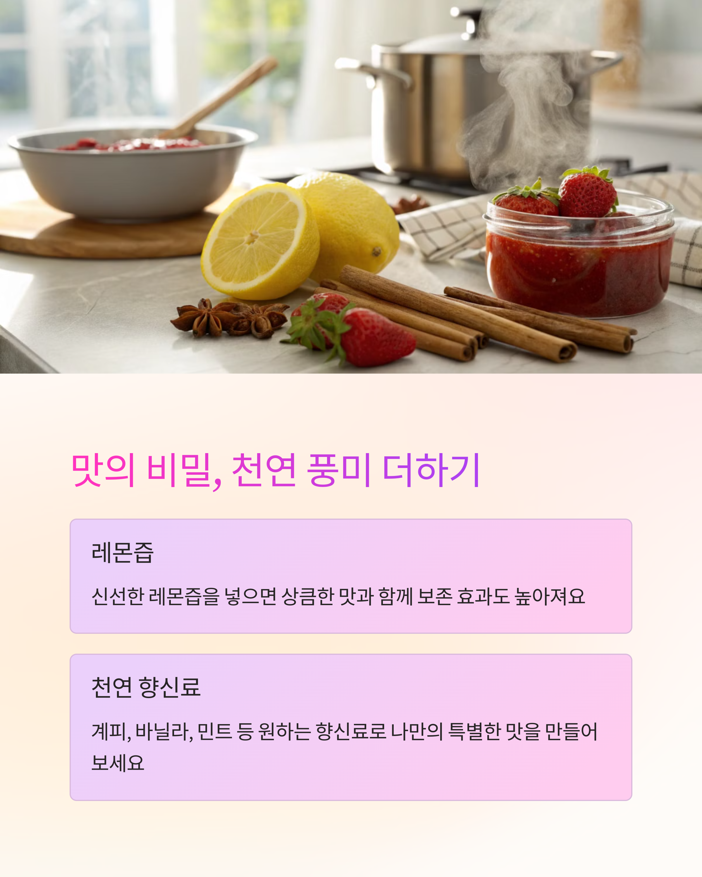 | 바닐라빈 또는 바닐라 익스트랙 | 잼 끓일 때 중간에 소량 | 고급 디저트 향과 감칠맛 상승 |