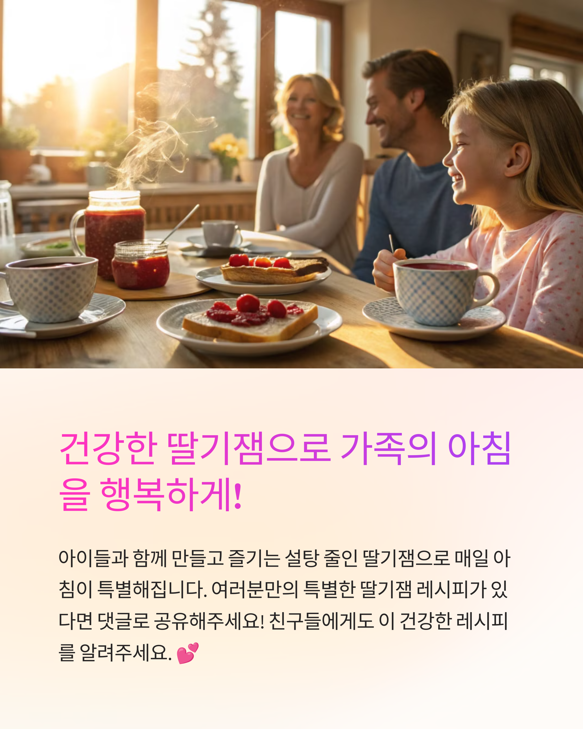 오늘 소개해드린 저당 딸기잼 레시피, 생각보다 쉽고 건강하죠? 직접 만든 잼은 맛도 정성도 배가 돼요. 저는 주말마다 한 병씩 만들어 친구들에게 선물도 하는데 반응이 정말 좋아요. 설탕을 확 줄였지만 풍미는 절대 줄지 않은 딸기잼, 올봄엔 꼭 한 번 만들어보세요! 여러분만의 비밀 재료를 더해보는 것도 재밌답니다. 만들어보시고 댓글이나 사진으로 공유해주시면 저도 너무 궁금할 것 같아요 :)