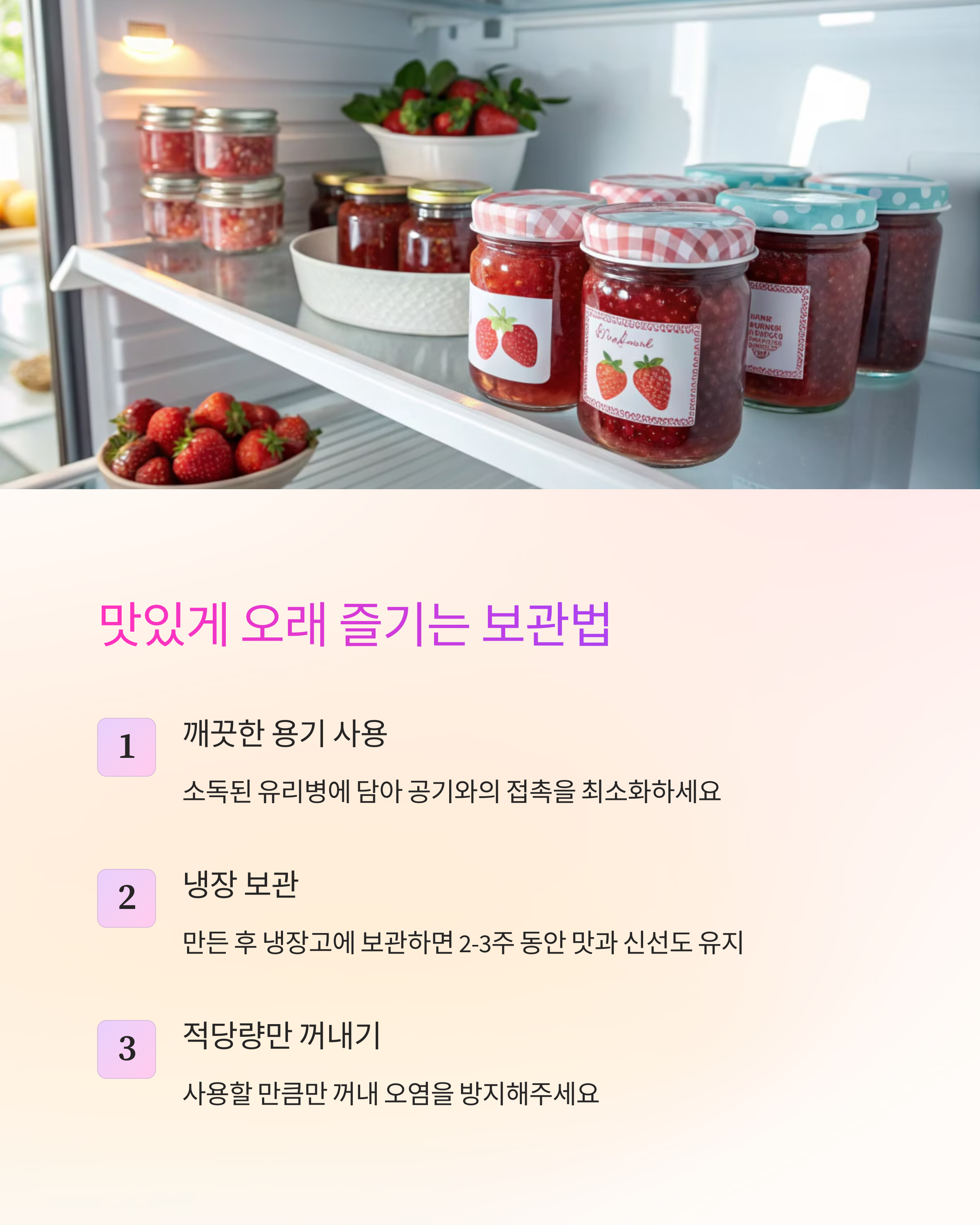 설탕을 줄인 잼은 아무래도 일반 잼보다 보존성이 낮기 때문에, 보관에 조금 더 신경을 써야 해요. 가장 중요한 건 병을 열탕 소독하고 바로 뜨거운 잼을 담아 밀봉하는 거예요. 이렇게 하면 상온에서도 1~2주, 냉장 보관 시 1~2개월은 거뜬하답니다. 그래도 가능한 한 빨리 먹는 게 가장 맛있고 안전하죠!