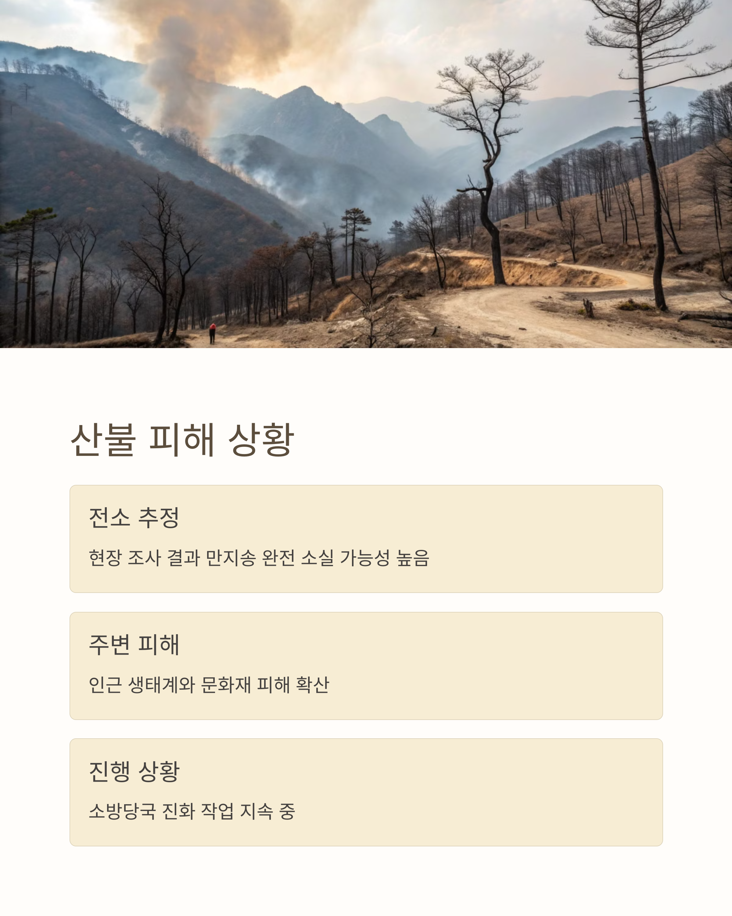 | 문화재 피해 | 만지송 전소 추정 (정밀 조사 중) |