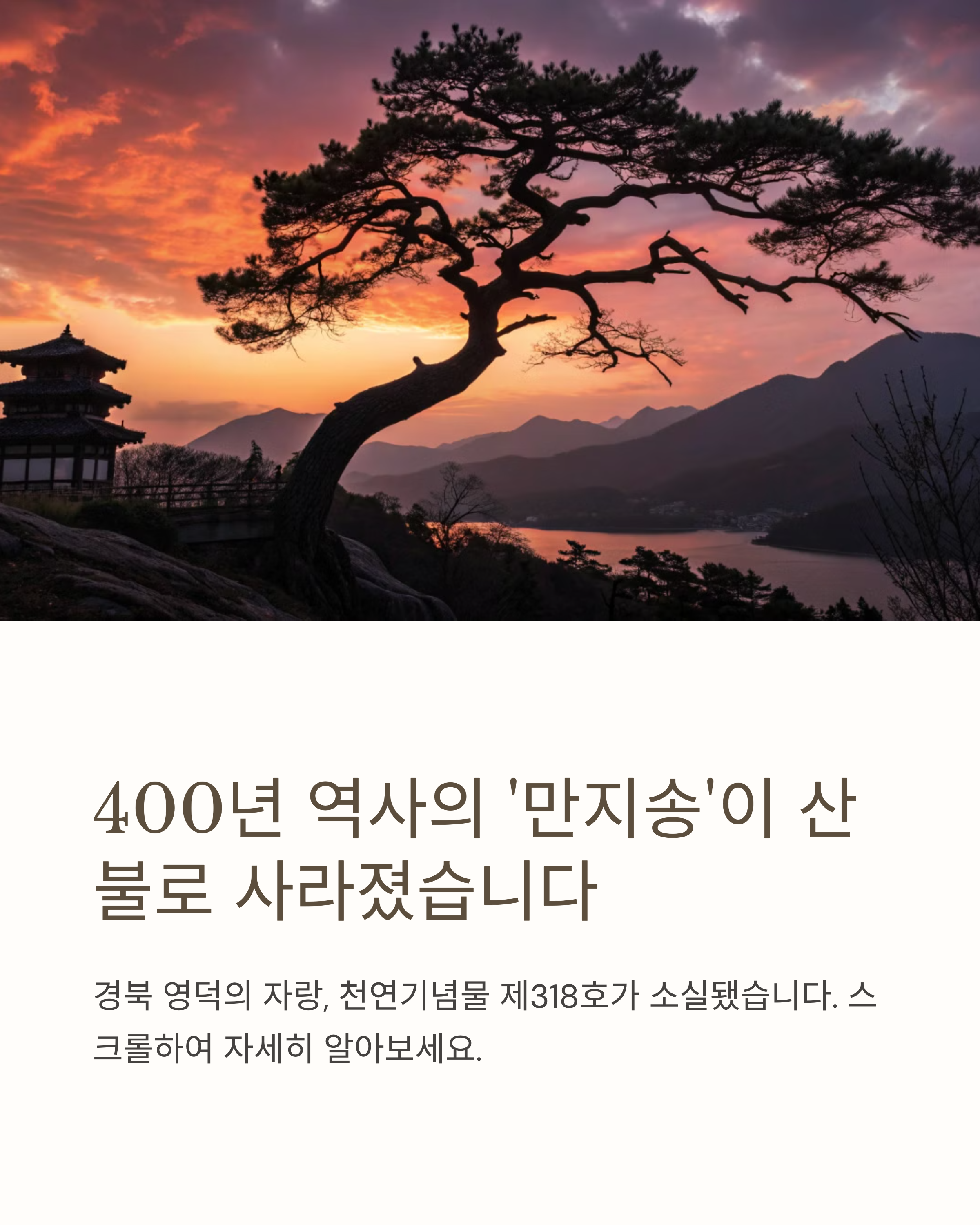 우리의 자연유산이 사라졌습니다. 400년 세월을 견뎌온 천연기념물 '만지송'이 경북 영덕 산불로 전소된 것으로 추정됩니다.