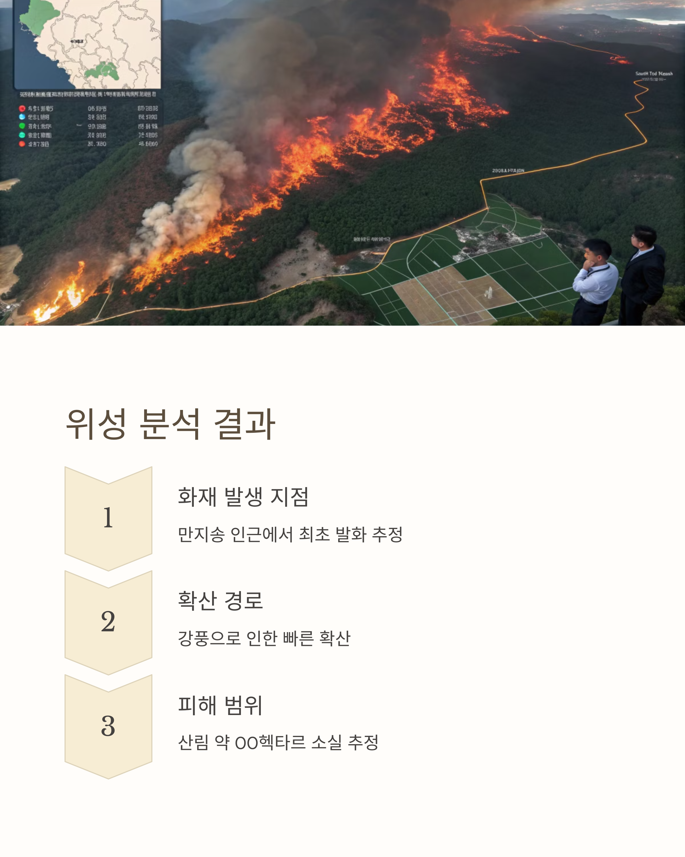 | 위성 관측 자료 | 해당 좌표 화염·온도 증가 | 산불 영향 100% 일치 |