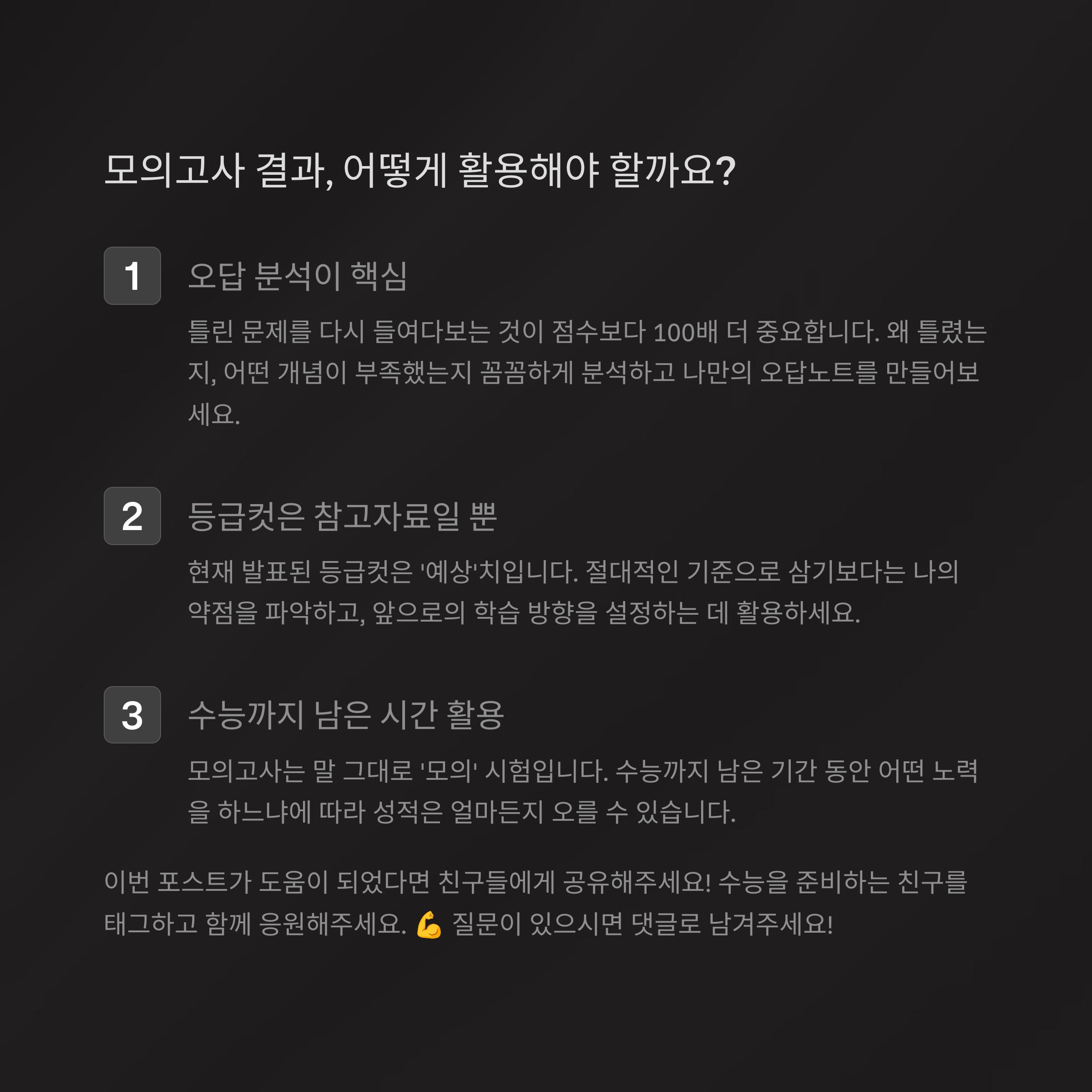 이번 7월 모의고사는 수능 전 자신의 위치를 객관적으로 점검할 수 있는 마지막 기회 중 하나였습니다. 결과에 일희일비하기보다는, 부족한 부분을 채워나가는 과정의 일부로 생각하셨으면 좋겠습니다. 궁금한 점이 있다면 언제든 댓글로 물어봐주세요~ 😊