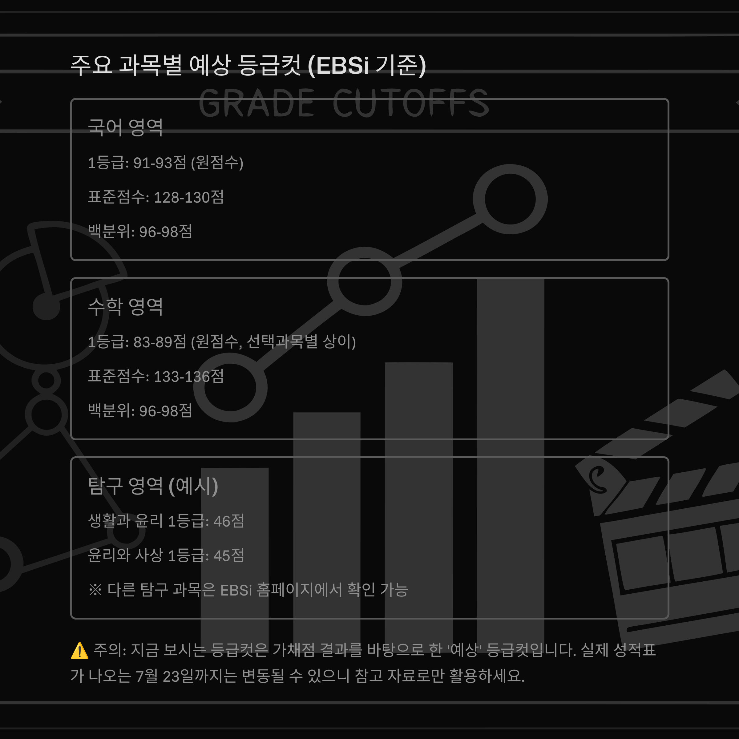 📊 주요과목 1등급컷 (원점수): 국어 91~93, 수학 83~89점대 예상. (선택과목별 상이)