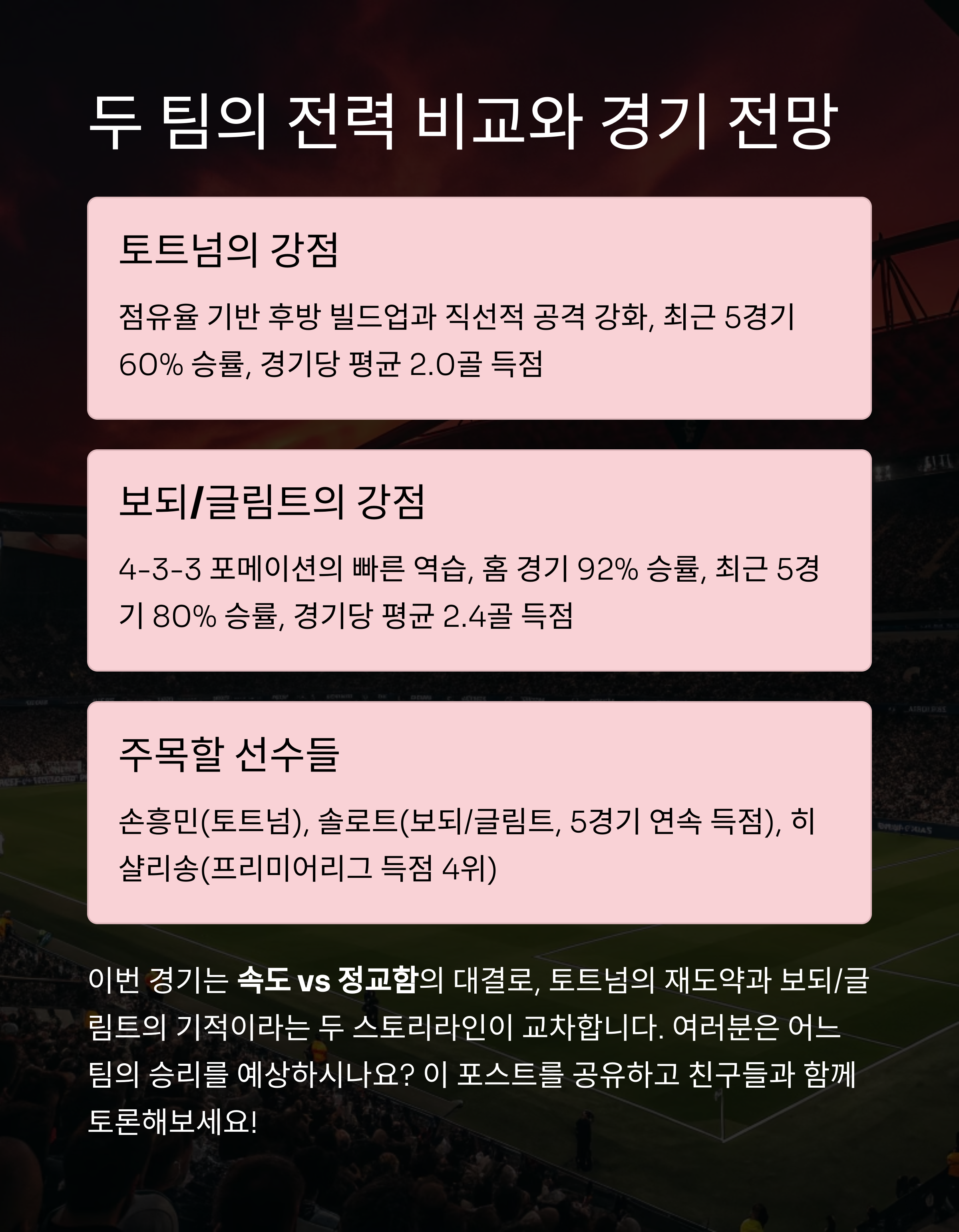 | 양팀 평균 슈팅 수 | 14.2 (토트넘), 12.8 (보되) | 공격 전개 적극성 유사 |