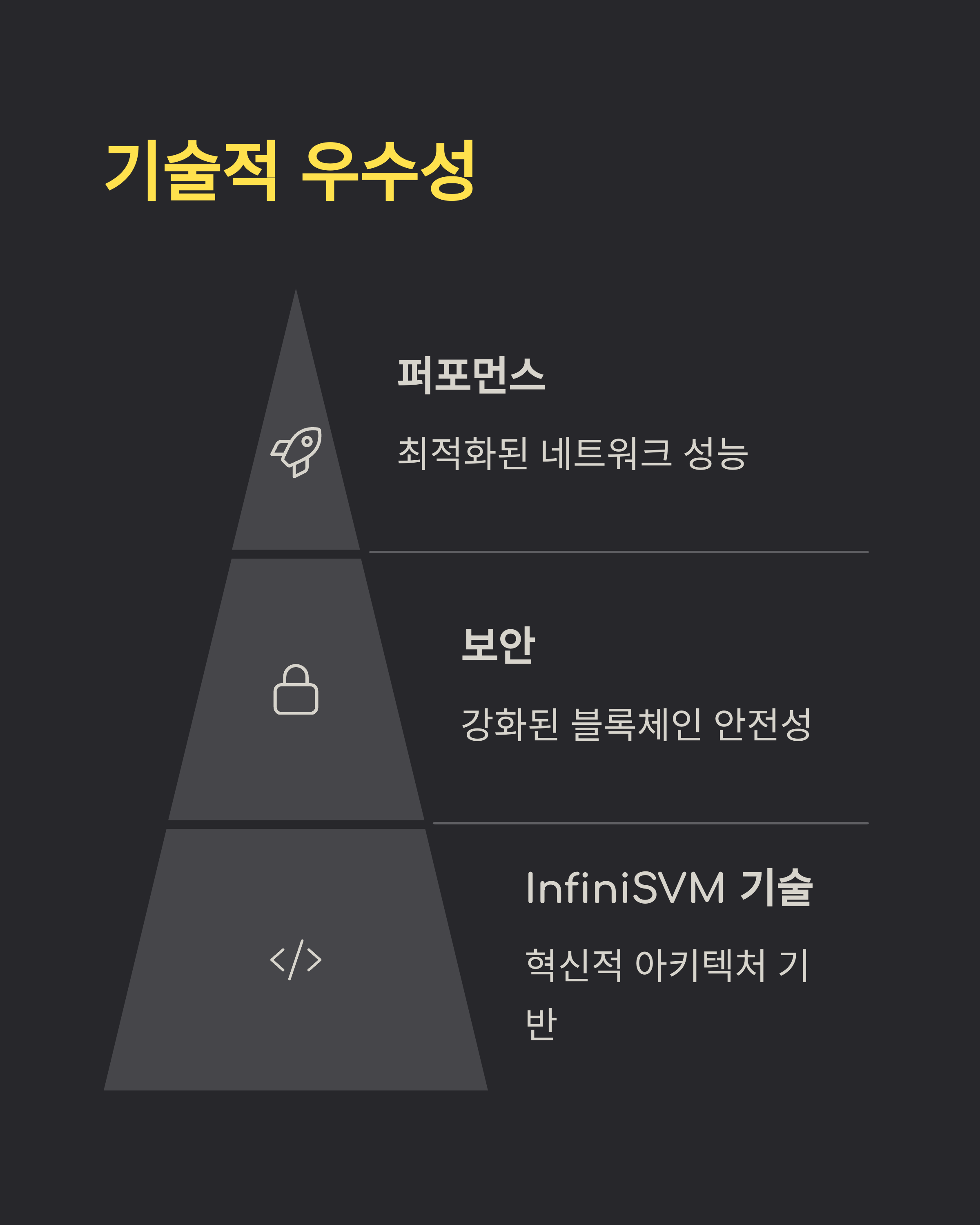 InfiniSVM 기반 아키텍처로 병렬 트랜잭션 처리와 고속 검증 기능을 갖추고 있어, 높은 TPS를 요구하는 디앱에 최적화되어 있습니다.