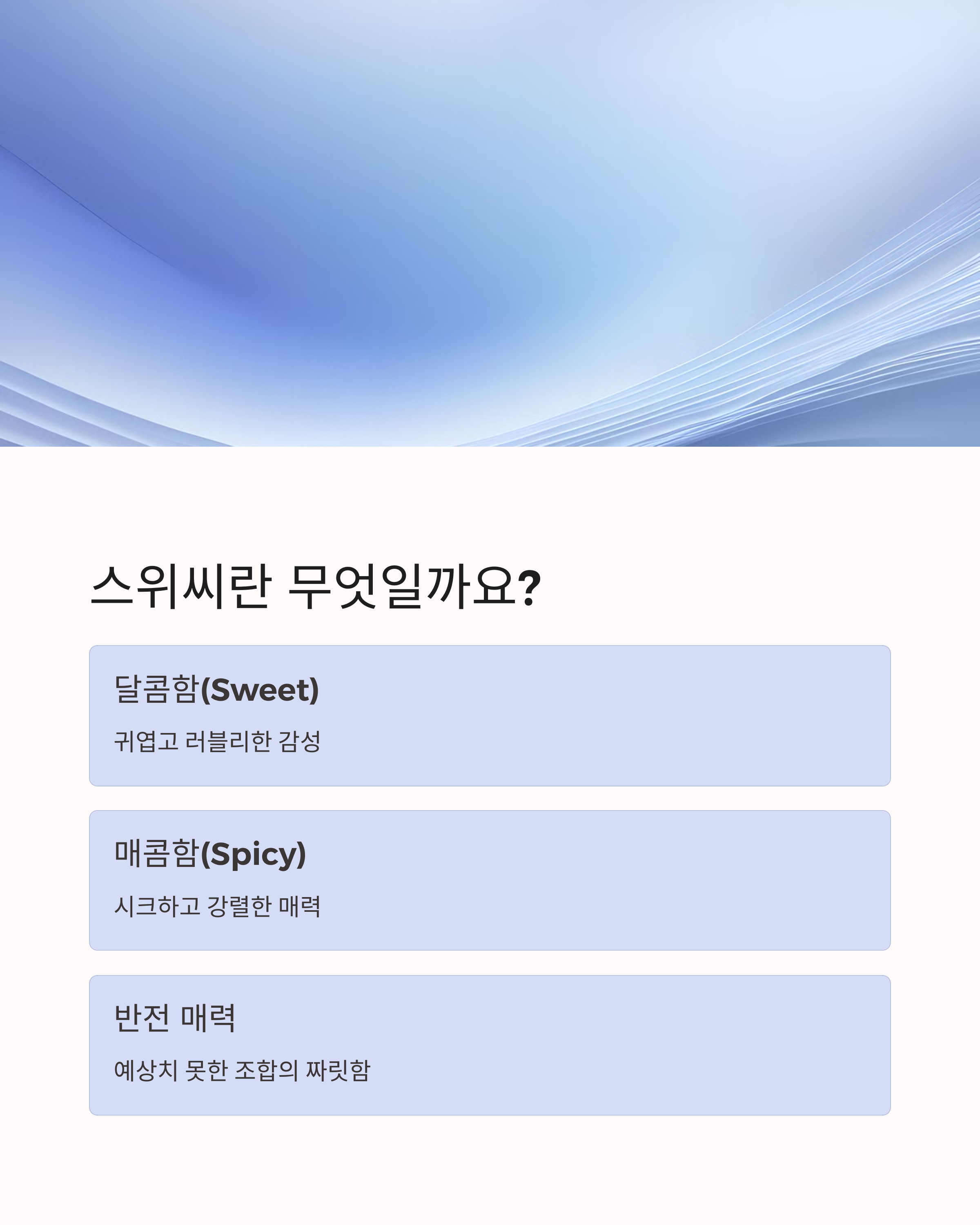 ‘스위씨(Swicy)’는 영어 단어 sweet(달콤한)spicy(매콤한)의 합성어로, 단순히 맛을 표현하는 데서 나아가 상반된 매력을 동시에 갖춘 감성을 말합니다. 예를 들면, 겉은 사랑스러운데 말투는 살짝 츤데레, 또는 스타일은 러블리한데 눈빛은 시크한 느낌! 원래는 음식 조합에서 시작된 단어지만, 2024년 말부터는 패션, 뷰티, SNS 콘텐츠 등 감성 전반으로 확장되며 Z세대 유행어로 자리 잡았어요.