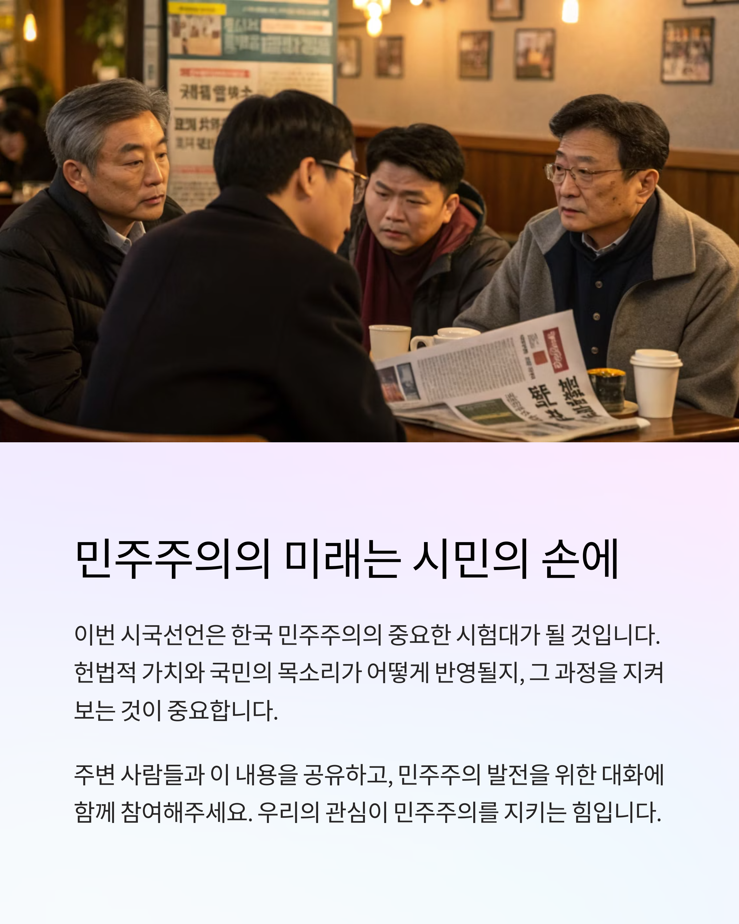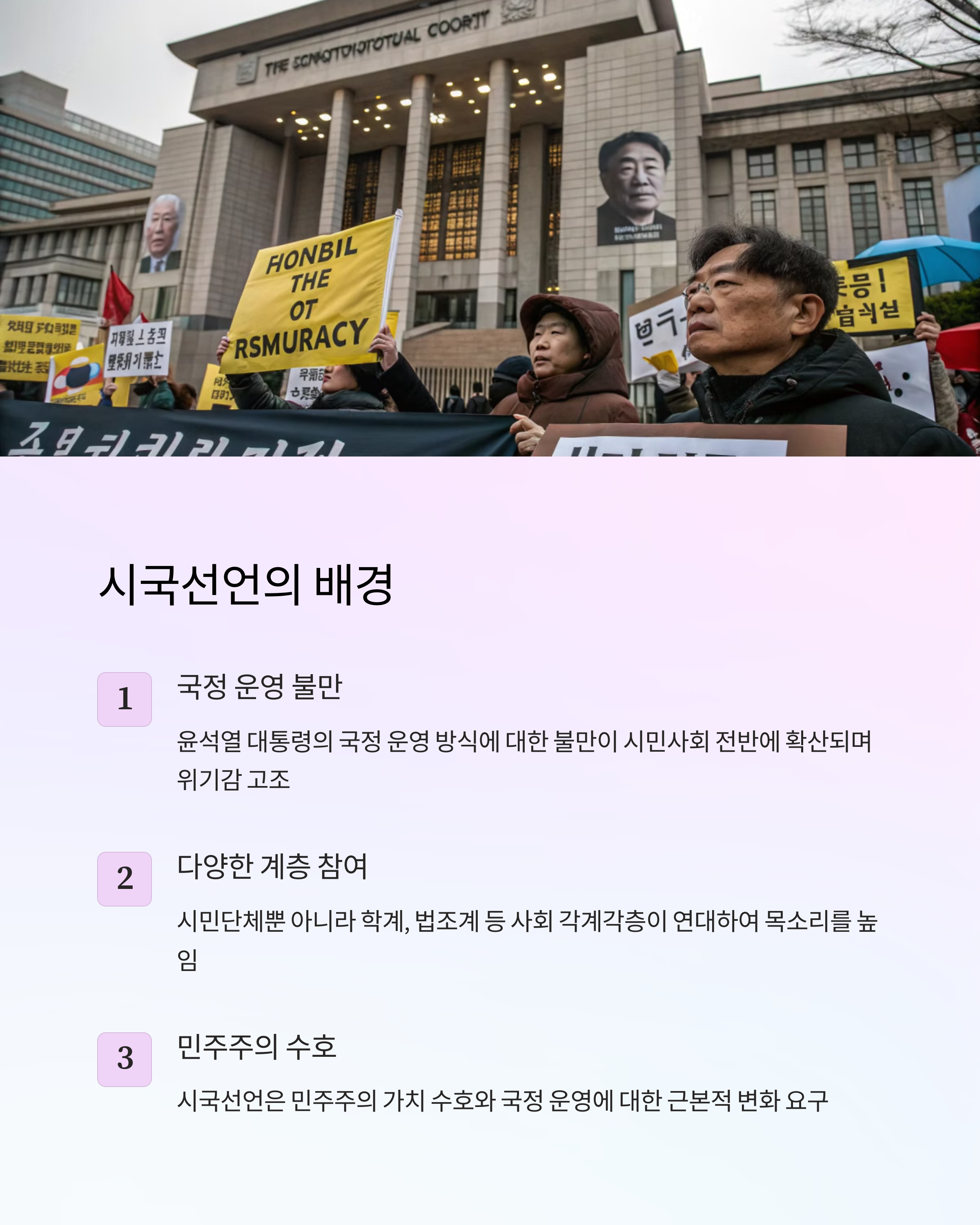 이처럼 다양한 사회 구성원이 참여한 시국선언은 단순한 정치적 주장 그 이상의 의미를 가지며, 우리 사회의 민주주의 가치가 어디로 향해야 하는지를 고민하는 계기가 되고 있습니다.