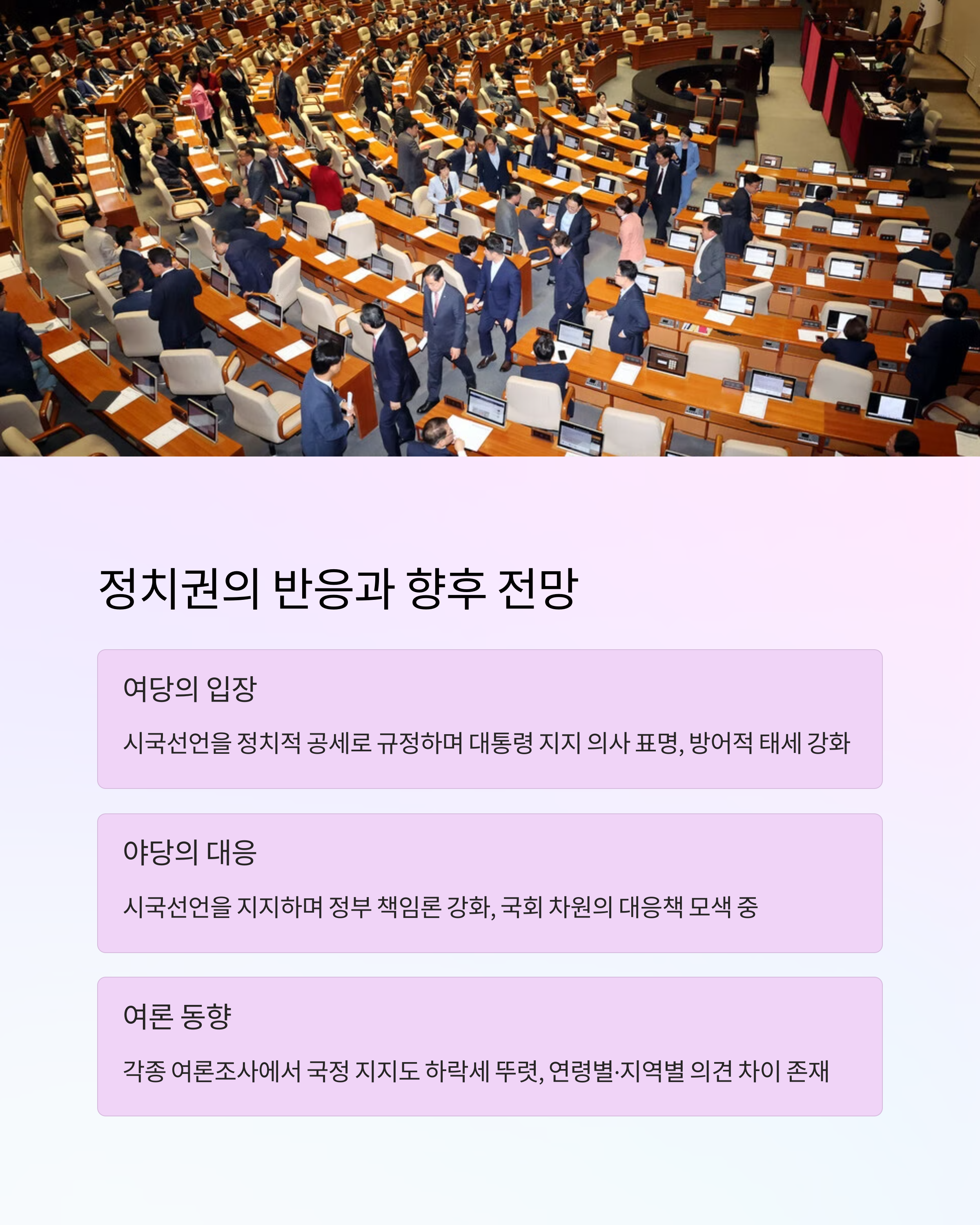 시국선언 이후 시민사회는 다양한 반응을 보이고 있습니다. 많은 시민들이 SNS를 통해 지지를 표명하고 있으며, 전국 곳곳에서 촛불 집회와 시위가 잇따르고 있습니다. 반면, 정부와 여당은 이번 선언이 정치적 의도를 가진 행위라며 반박하고 있습니다.