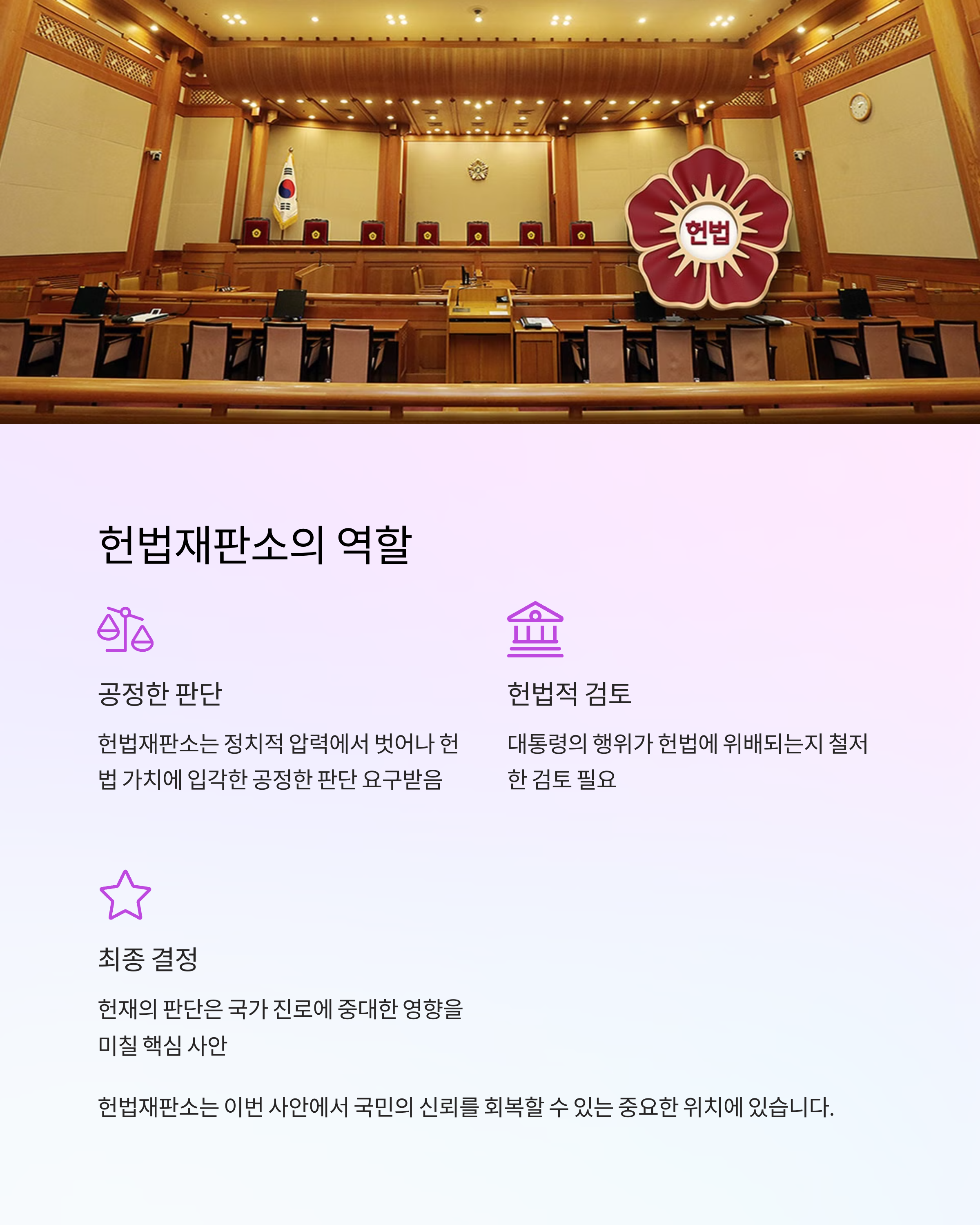 헌법재판소는 대통령의 헌법 위반 여부를 심사하고, 국회에서 탄핵소추가 진행될 경우 최종적인 결정을 내리는 역할을 합니다. 이번 시국선언에서도 헌법재판소의 공정한 판단이 중요한 변수로 작용할 것입니다.