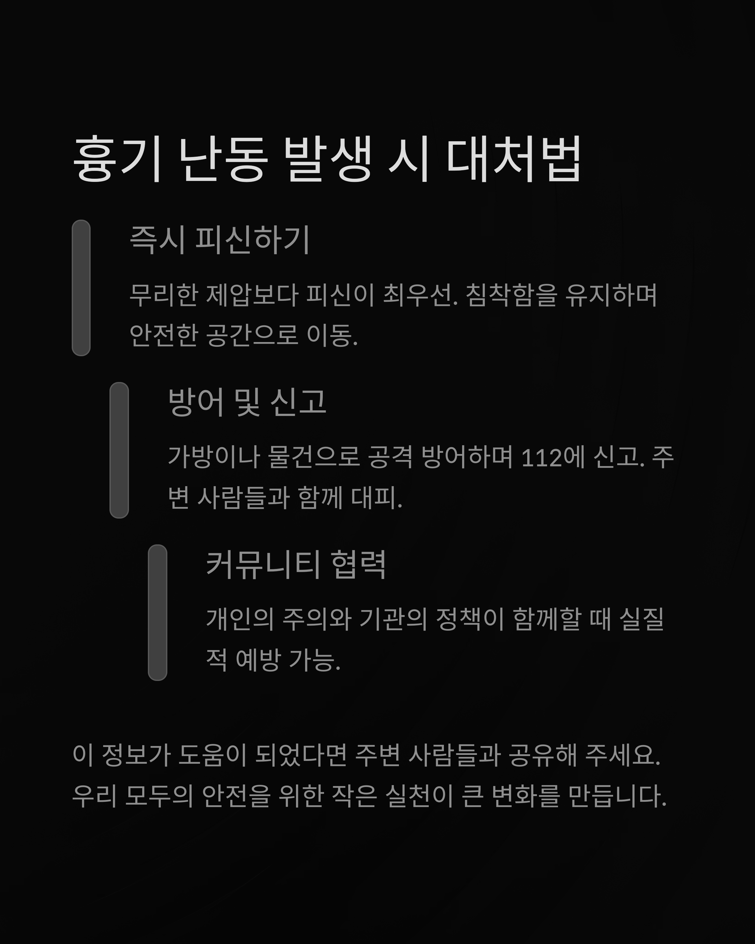 즉시 자리를 피하고, 가방이나 물건으로 공격을 방어하며, 112에 신고해야 합니다. 위험한 상황에서는 무리한 제압보다 피신이 우선입니다.