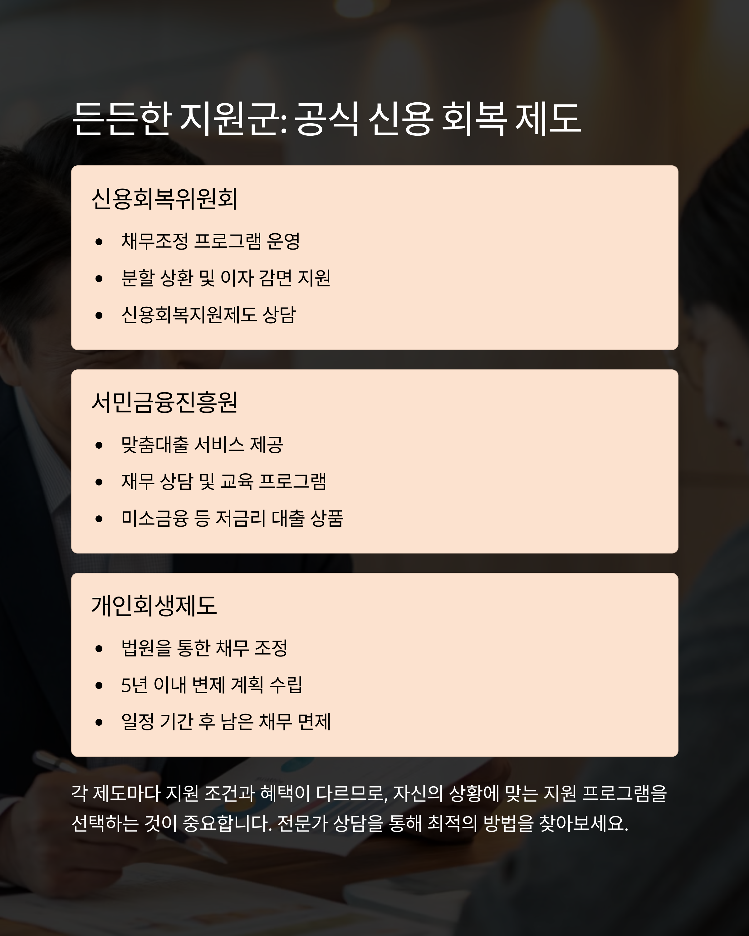 다행히 우리나라에는 다양한 신용회복 지원제도가 마련돼 있어요. 대표적으로 신용회복위원회가 운영하는 채무조정 프로그램이 있고, 개인회생 제도나 바꿔드림론, 새희망홀씨 대출처럼 서민금융지원도 존재합니다. 각 제도는 대상자와 조건이 다르므로 본인 상황에 맞는 방법을 선택해야 해요.