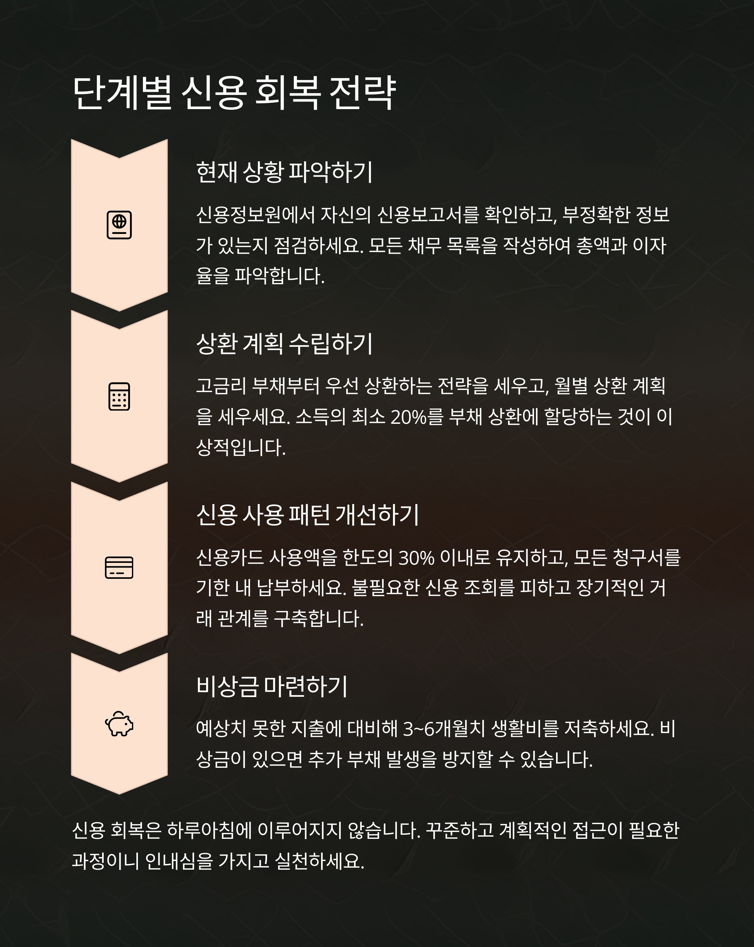신용회복은 단기전이 아니라 중장기 프로젝트예요. 작은 습관부터 차근차근 쌓아나가야 진짜 회복으로 이어질 수 있어요. 처음에는 아무 변화가 없는 것 같더라도, 3개월, 6개월, 1년이 지나면 확실한 변화가 생깁니다. 아래는 신용을 다시 쌓기 위한 단계별 전략입니다.