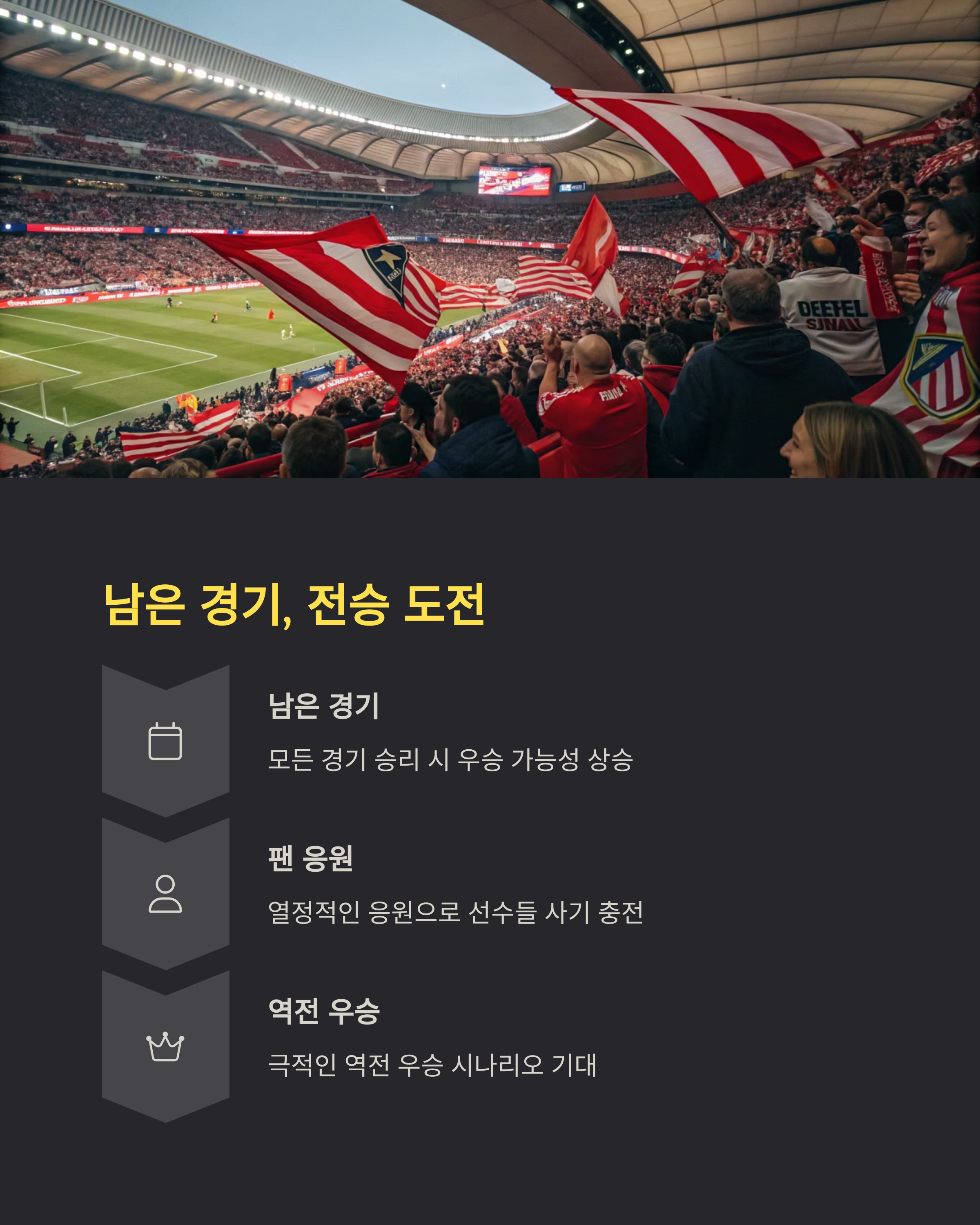 수치상으론 쉽지 않지만, 축구는 모르는 스포츠잖아요? 특히 시메오네 감독이 지휘하는 ATM은 종종 기적 같은 드라마를 써왔기에, 바르사와 레알의 실수를 틈탄 추격 가능성도 여전히 남아 있습니다.