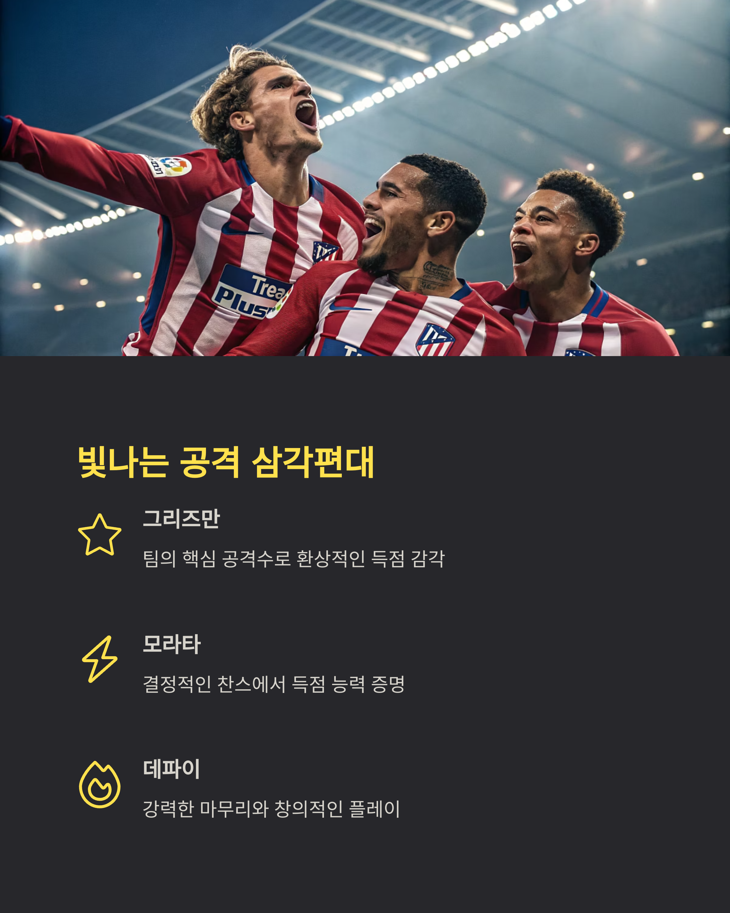 수비 안정화와 함께 공격진의 밸런스가 살아났어요. 특히 그리즈만, 모라타, 데파이 등 다득점 옵션이 살아나며 전방 압박이 효과적으로 작동 중입니다.