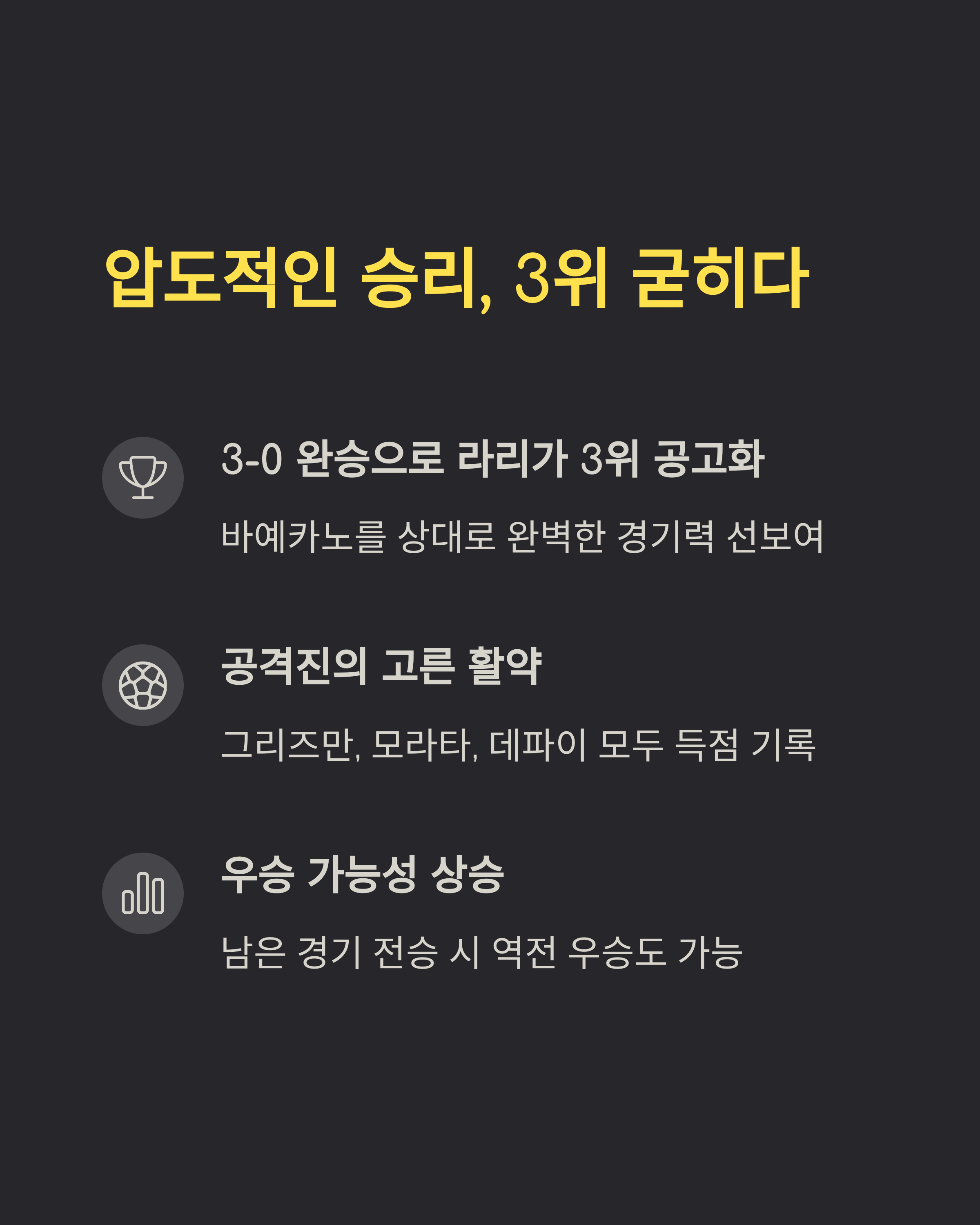 안녕하세요, 축구 팬 여러분! 요즘 유럽축구는 리그마다 흥미로운 레이스가 펼쳐지고 있는데요, 특히 라리가에서는 아틀레티코 마드리드가 절대 포기하지 않는 DNA를 보여주며 다시 한번 우승 경쟁에 불을 지피고 있습니다. 바예카노와의 경기에서 3-0 대승을 거두며 분위기 반전에 성공한 ATM의 행보, 과연 어디까지 이어질 수 있을까요? 오늘은 그 경기의 포인트와 향후 전망을 집중 분석해볼게요!