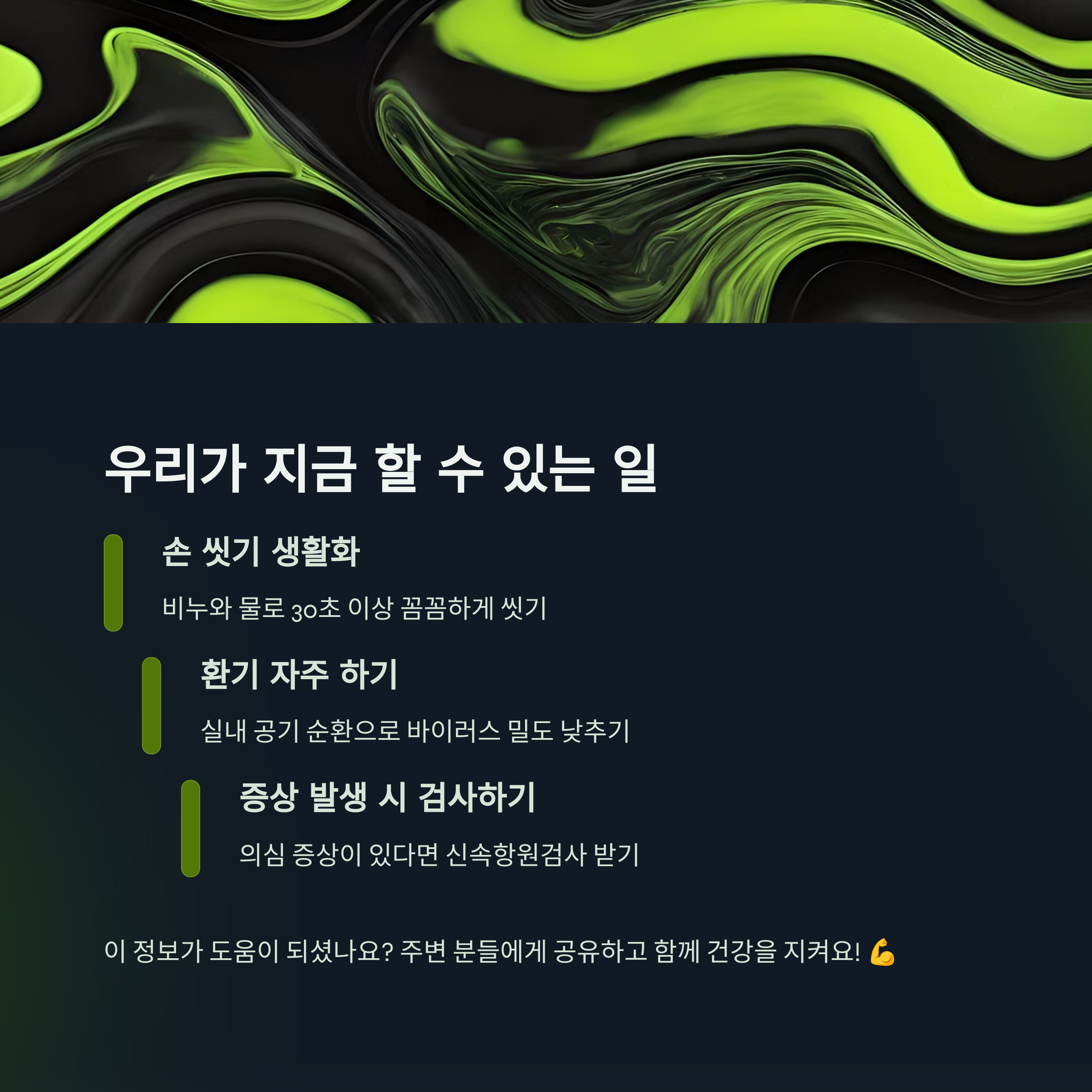 - 우리의 역할: 손 씻기, 기침 예절, 환기, 증상 시 검사 및 휴식, 고위험군 예방 접종 고려 등 개인 방역 수칙을 철저히 지키는 것이 중요해요.