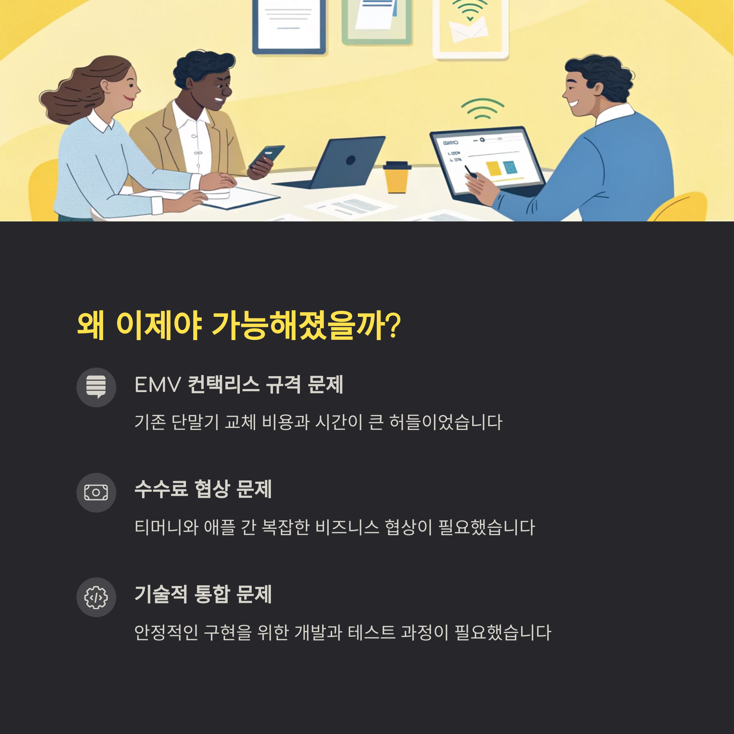 - 오랜 기다림의 이유: 그동안 EMV 컨택리스 규격 단말기 교체 부담과 애플과의 수수료 협상 문제 등이 주요 원인으로 꼽혔습니다. 이제 이 문제가 해결된 것으로 보입니다.