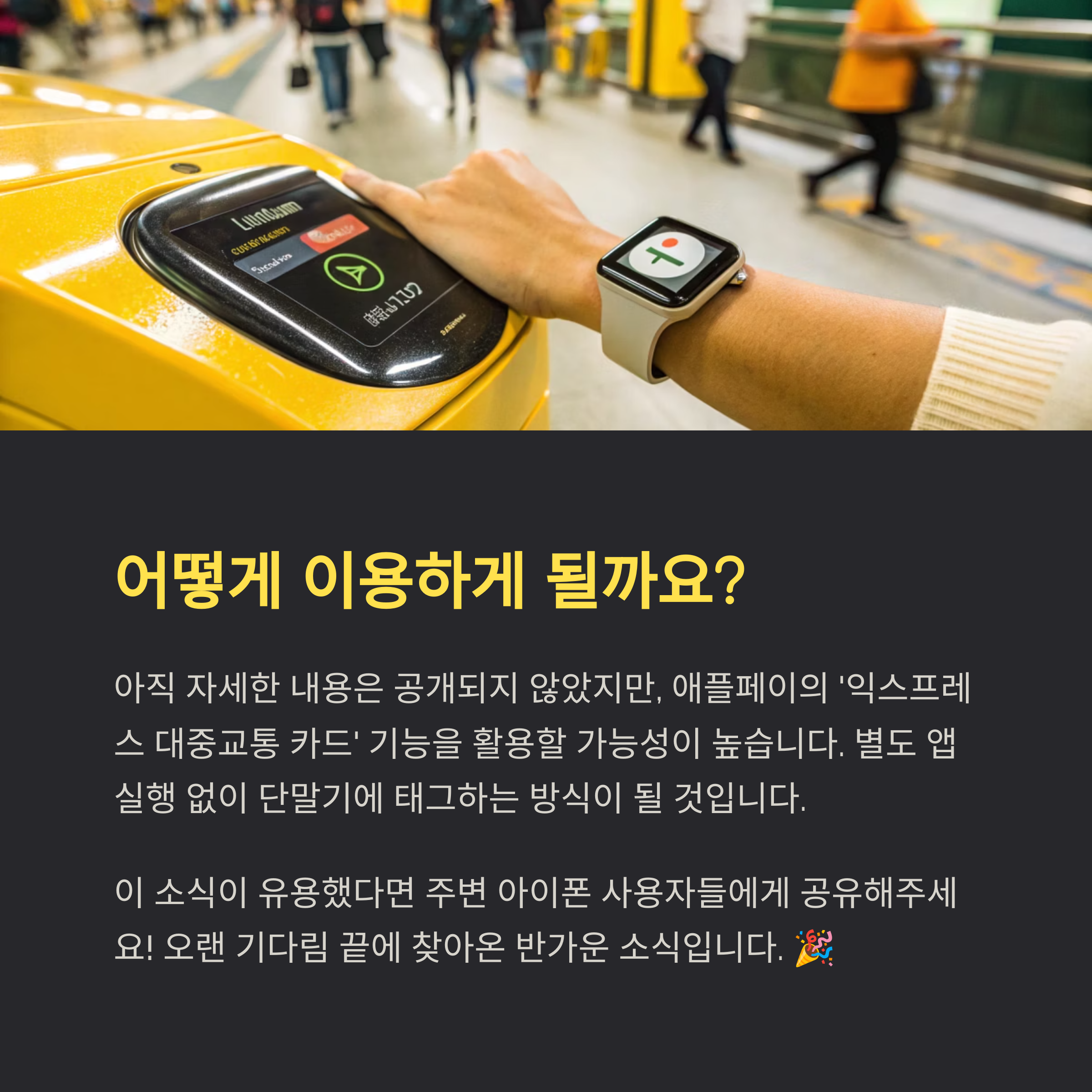 - 기대되는 변화: 실물 카드 없이 폰이나 워치로 편리하게 대중교통을 이용하고, 지갑 분실 위험 감소, 해외 방문객 편의 증대, 나아가 애플페이 사용처 확대의 신호탄이 될 것으로 기대됩니다.