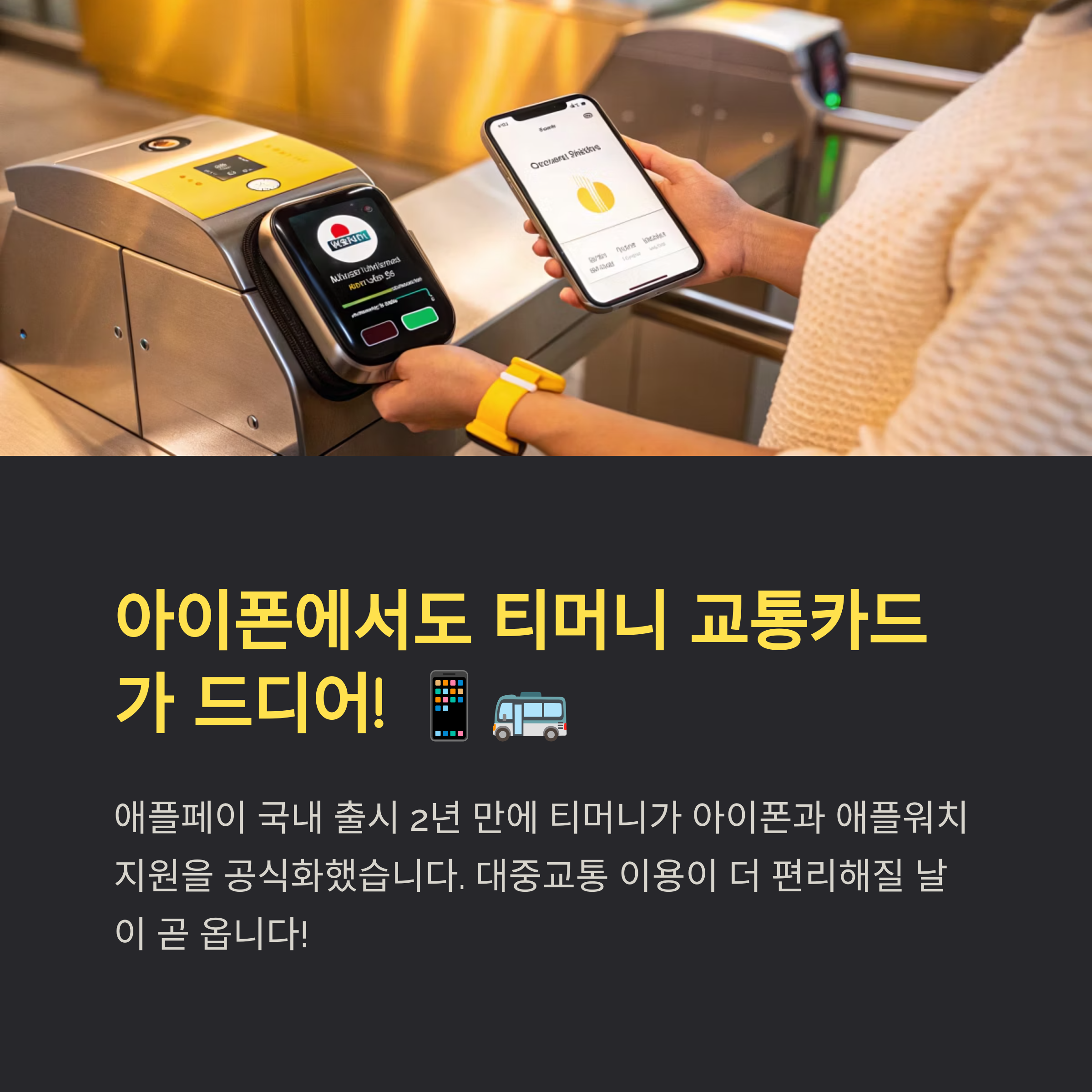 - 티머니, 아이폰/애플워치 지원 공식화: 애플페이 국내 출시 2년 만에 티머니가 아이폰 및 애플워치 서비스를 예고했습니다. 드디어 아이폰 사용자들도 편리하게 대중교통을 이용할 수 있게 되는 것이죠.