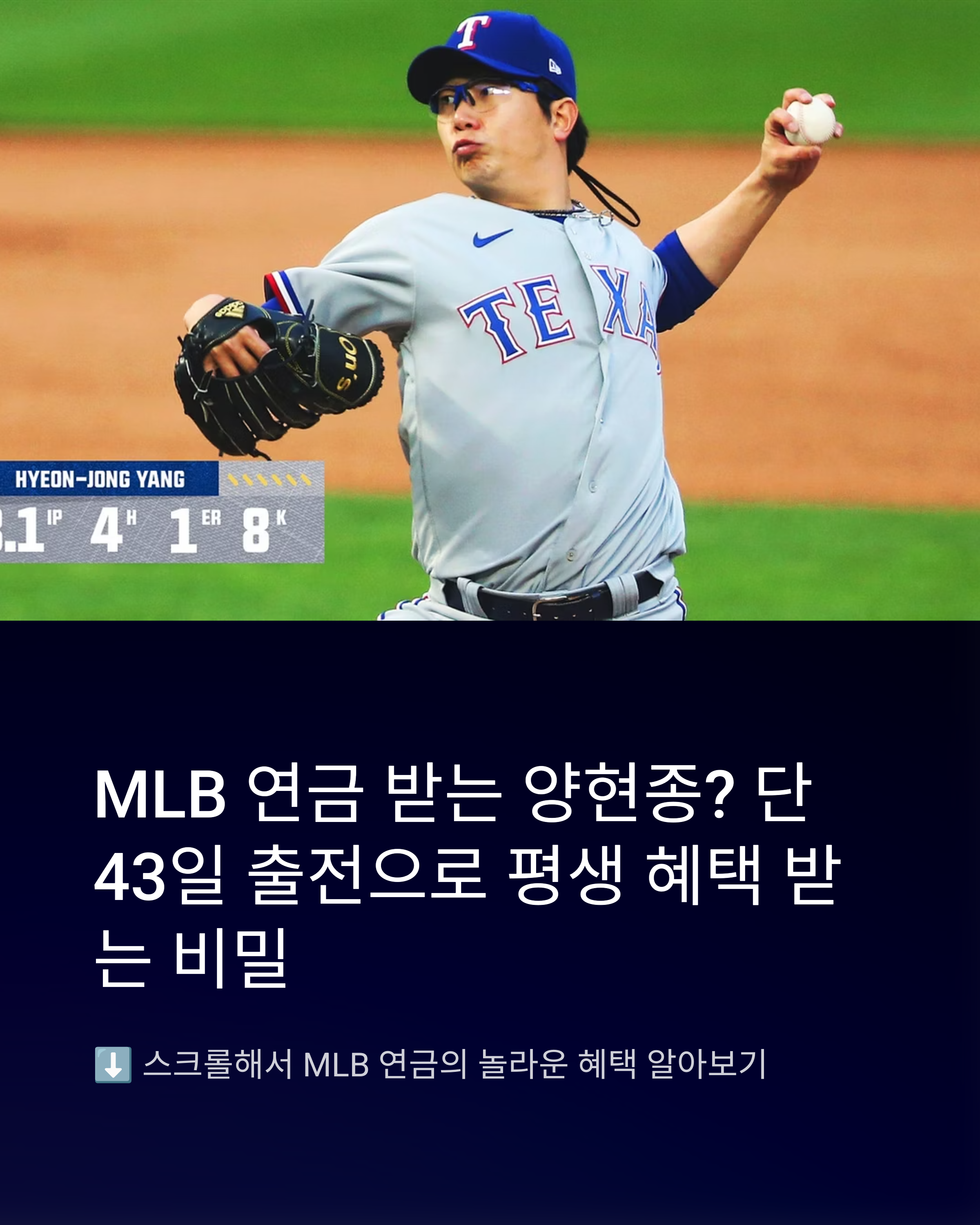 안녕하세요! 오늘은 KBO 팬들에게도 익숙한 이름, 양현종 선수의 메이저리그 연금 이야기를 들고 왔습니다. 사실 메이저리그 연금 제도는 많은 팬들에게도 생소한 개념이지만, 최근 뉴스에서 “양현종도 연금 자격 획득”이라는 기사가 나오며 이슈가 됐죠. 과연 어느 정도 금액이고, 어떤 조건으로 받을 수 있는지, 그리고 비슷한 사례에는 누가 있는지까지 싹 정리해드립니다!