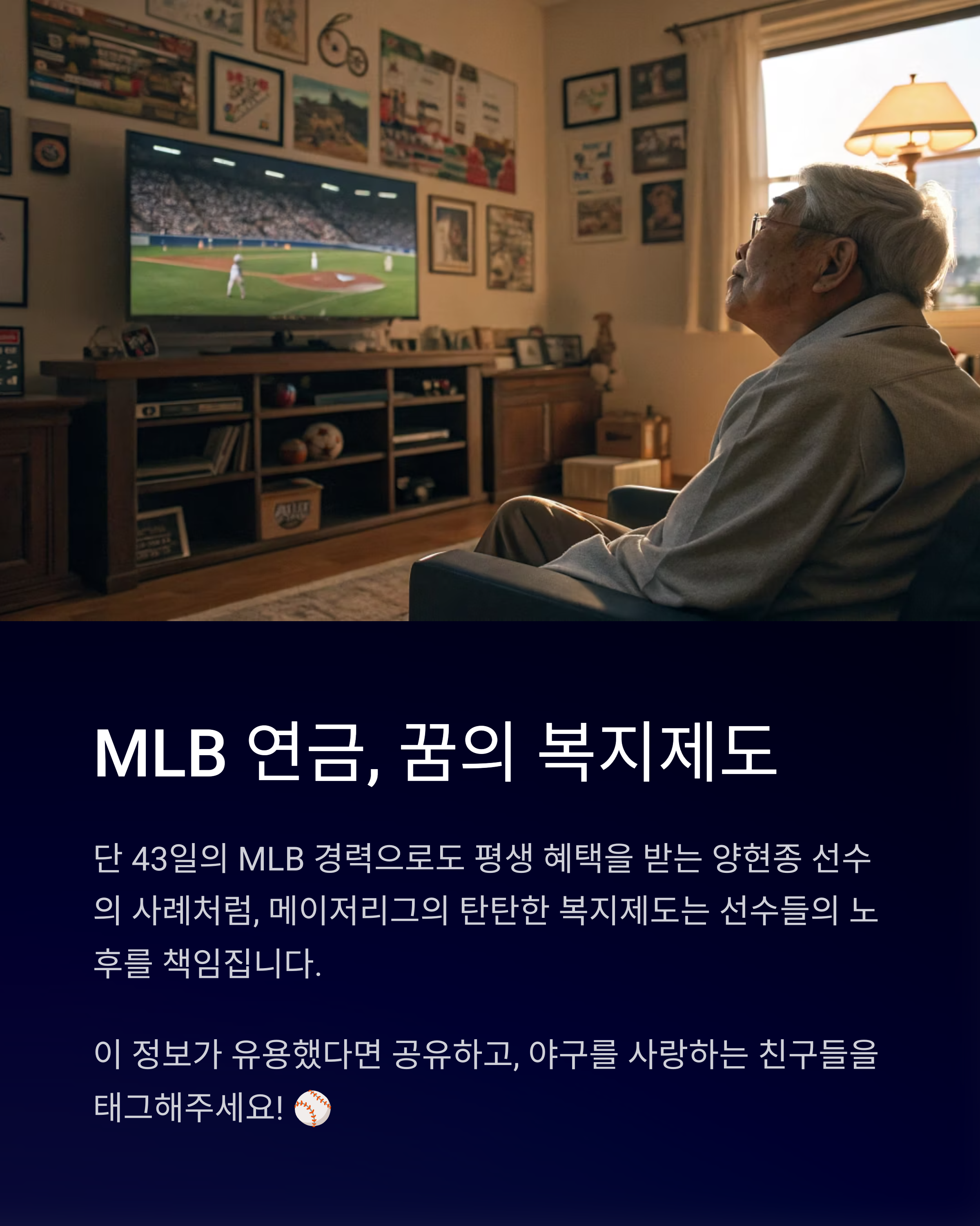 “MLB 연금만 있어도 평생 먹고산다”는 말, 이제 양현종 선수에게도 해당되는 이야기네요. 짧은 MLB 커리어였지만, 연금 자격 확보라는 의미 있는 성과를 남겼다는 점에서 큰 의미가 있습니다. 물론 금액이 엄청나진 않지만, 팬들 입장에선 “그저 부럽다”는 말이 절로 나오죠. 앞으로도 양현종 선수의 활약, 그리고 MLB 연금 제도에 대한 궁금한 이야기들 계속해서 다뤄보겠습니다. 댓글로 질문이나 의견 남겨주세요!