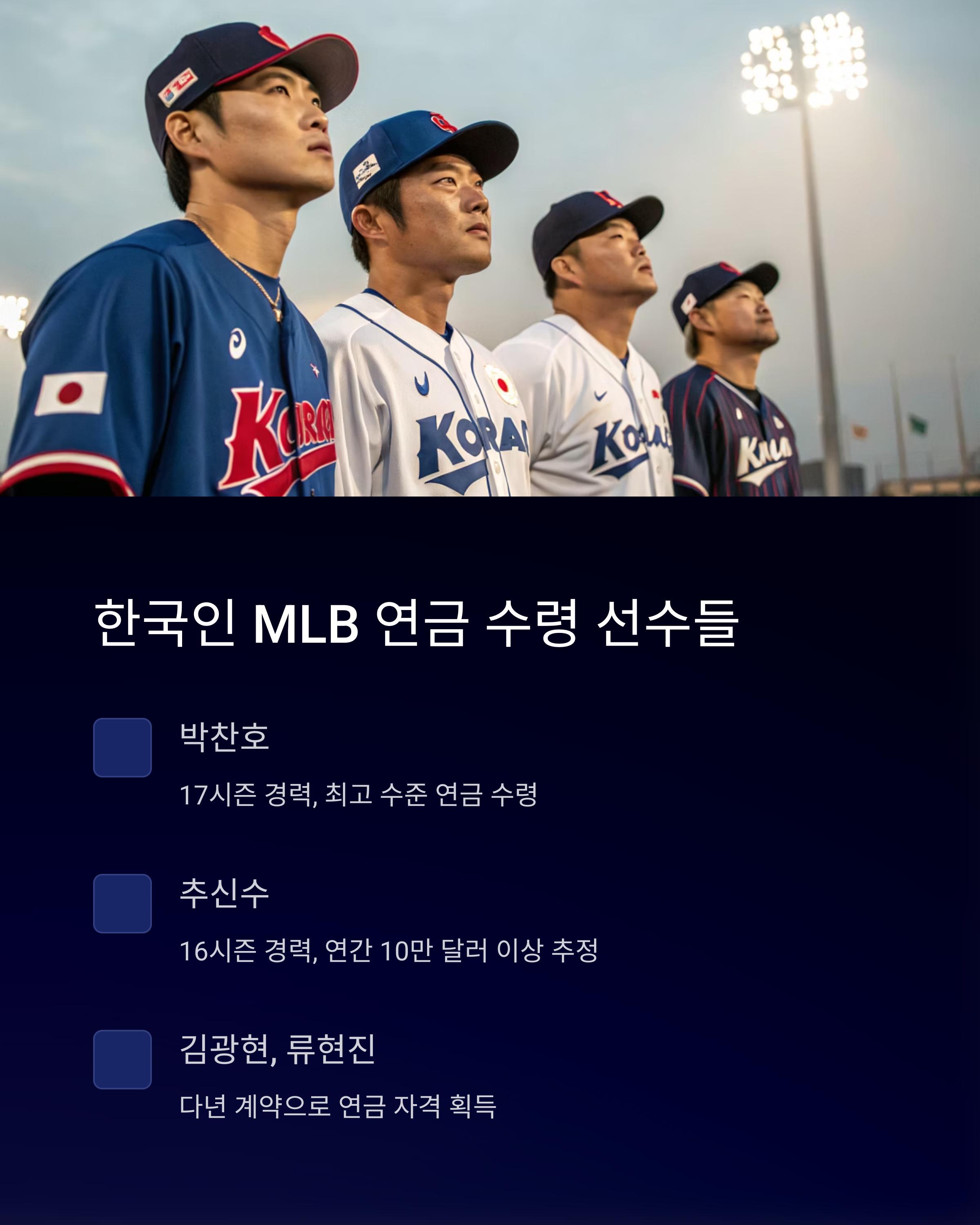 양현종 외에도 많은 한국인 메이저리거들이 연금 수령 자격을 가지고 있습니다. 특히 메이저리그에서 1년 이상 활약했던 선수들은 기본 수령액 이상을 받을 수 있어 노후 대비 측면에서도 의미 있는 자산이 될 수 있죠.