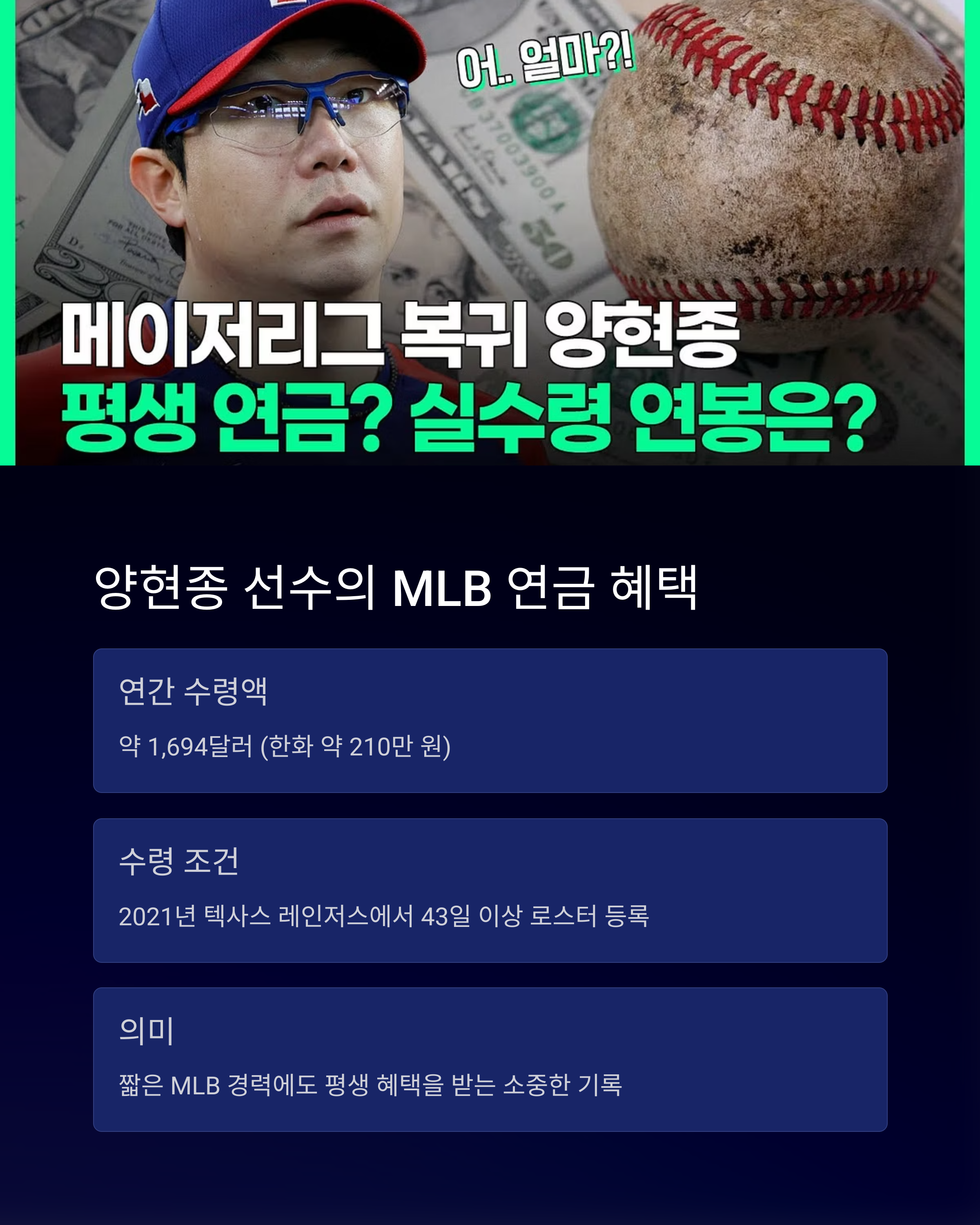 안녕하세요! 오늘은 KBO 팬들에게도 익숙한 이름, 양현종 선수의 메이저리그 연금 이야기를 들고 왔습니다. 사실 메이저리그 연금 제도는 많은 팬들에게도 생소한 개념이지만, 최근 뉴스에서 “양현종도 연금 자격 획득”이라는 기사가 나오며 이슈가 됐죠. 과연 어느 정도 금액이고, 어떤 조건으로 받을 수 있는지, 그리고 비슷한 사례에는 누가 있는지까지 싹 정리해드립니다!