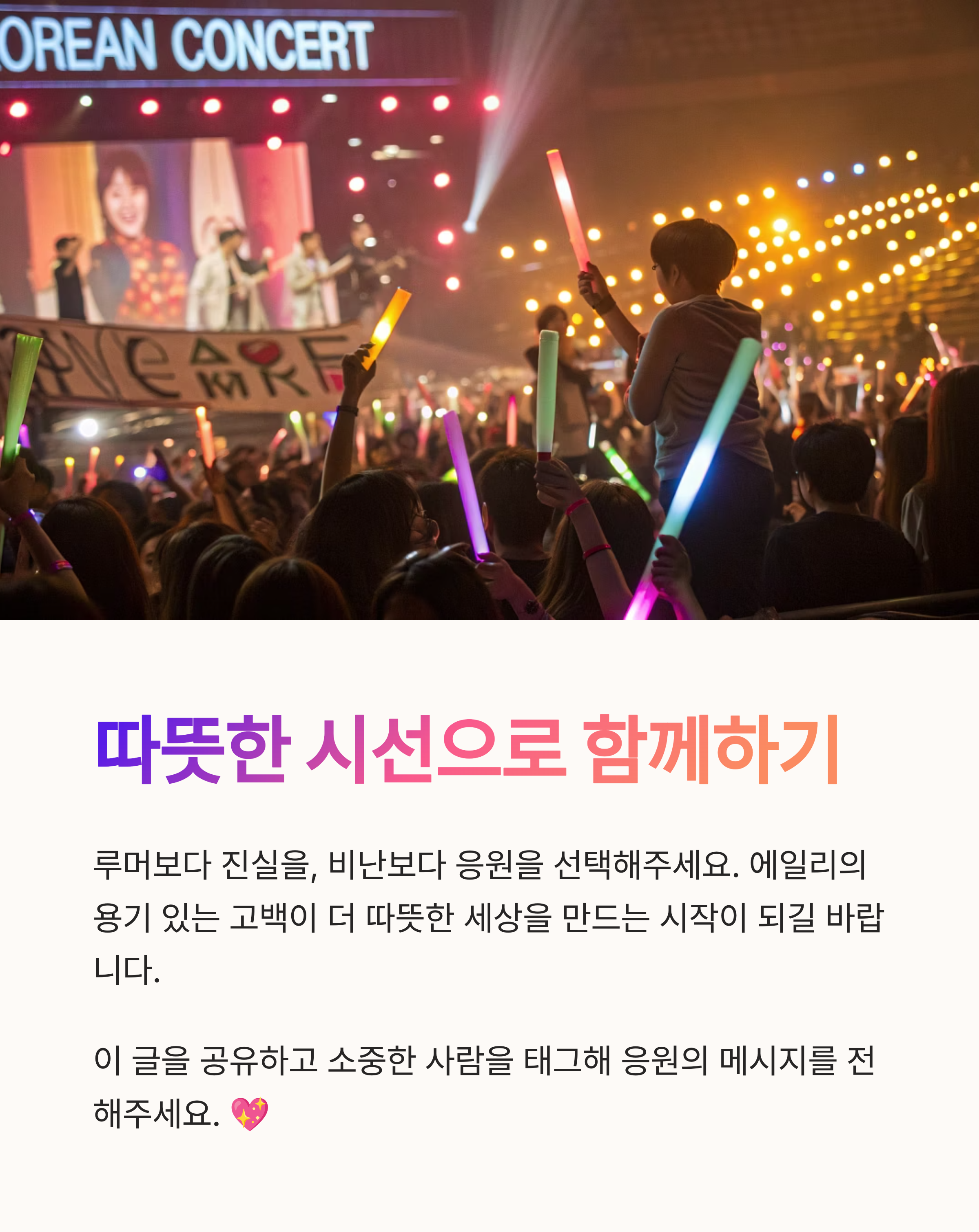 이번 에일리의 눈물은 단순한 해명이 아니라, 한 사람으로서의 진심이었습니다. 우리는 종종 유명인의 삶을 공공재처럼 소비하지만, 그 안에도 상처받고 힘들어하는 개인이 존재한다는 사실을 잊지 말아야 해요. 루머는 누군가에게는 가십이지만, 다른 누군가에게는 삶을 흔드는 고통일 수 있습니다. 앞으로는 좀 더 조심스럽고 따뜻한 시선으로 연예인을 바라보는 문화가 자리잡길 기대합니다. 에일리, 당신의 용기에 진심으로 박수를 보냅니다.