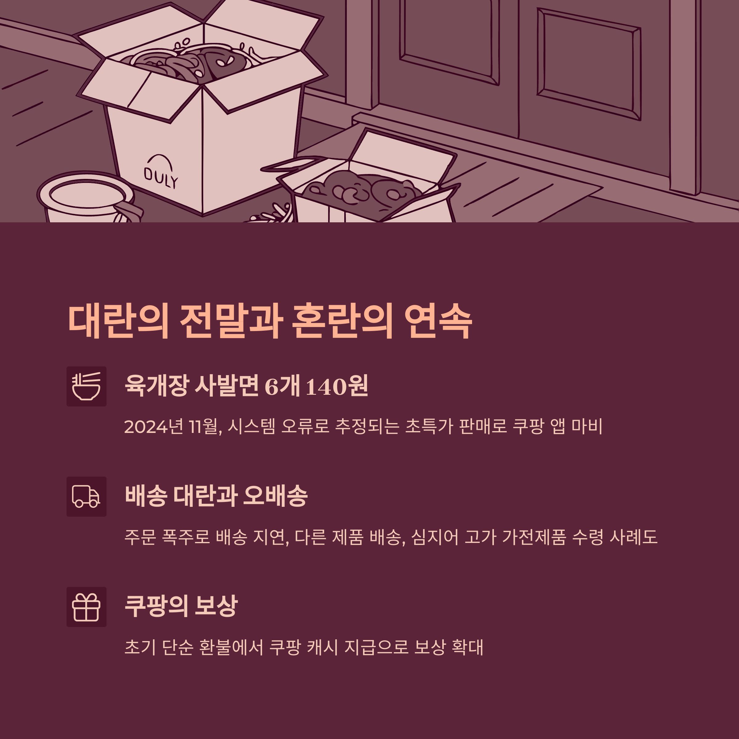 - 쿠팡의 보상 정책: 초기에는 단순 환불이었으나, 소비자 불만이 커지자 쿠팡 캐시 등 추가 보상으로 전환.