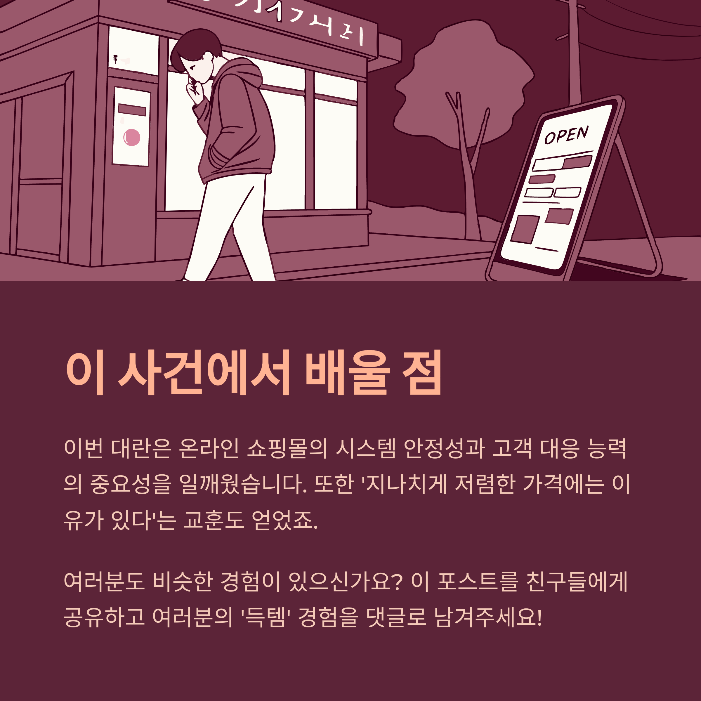 - 남겨진 교훈: ✅ 온라인 플랫폼의 시스템 안정화와 소비자 신뢰의 중요성.