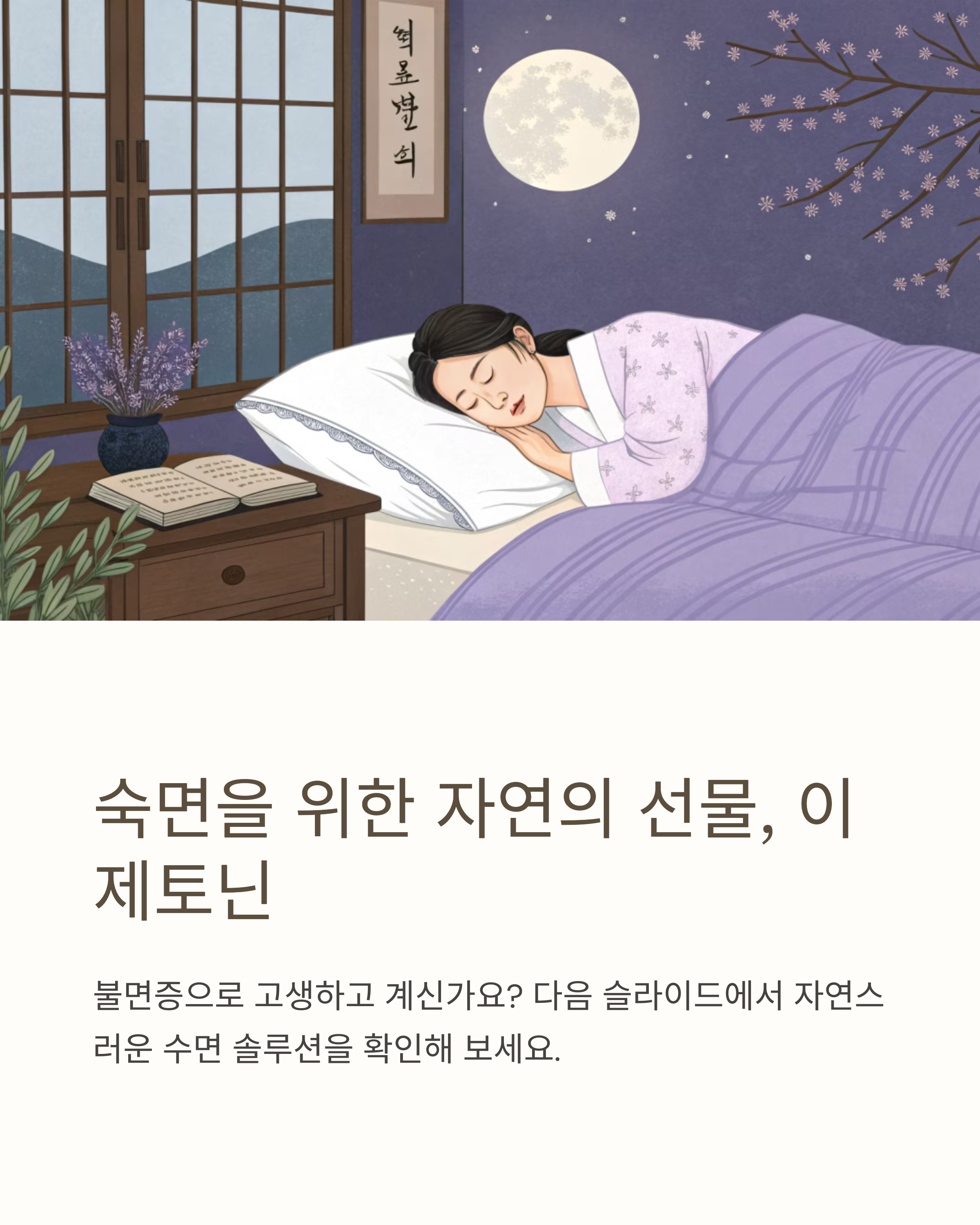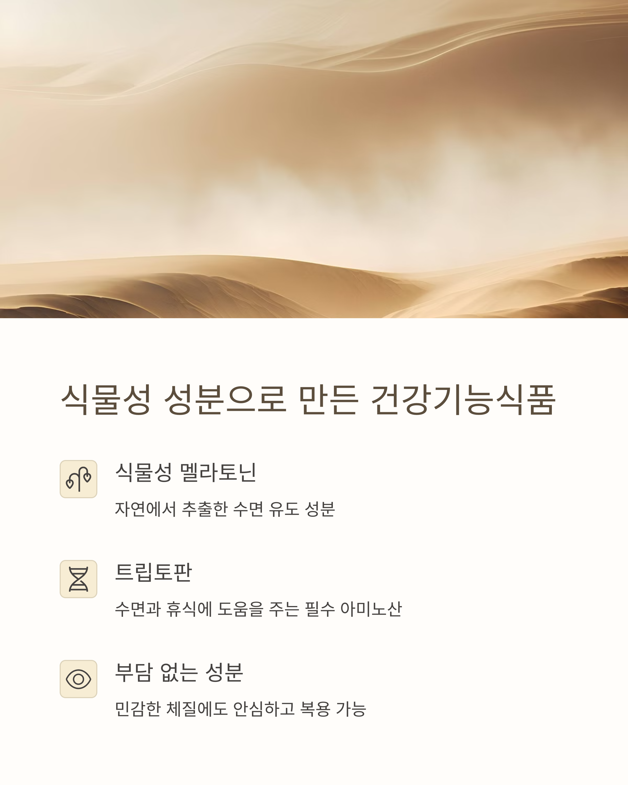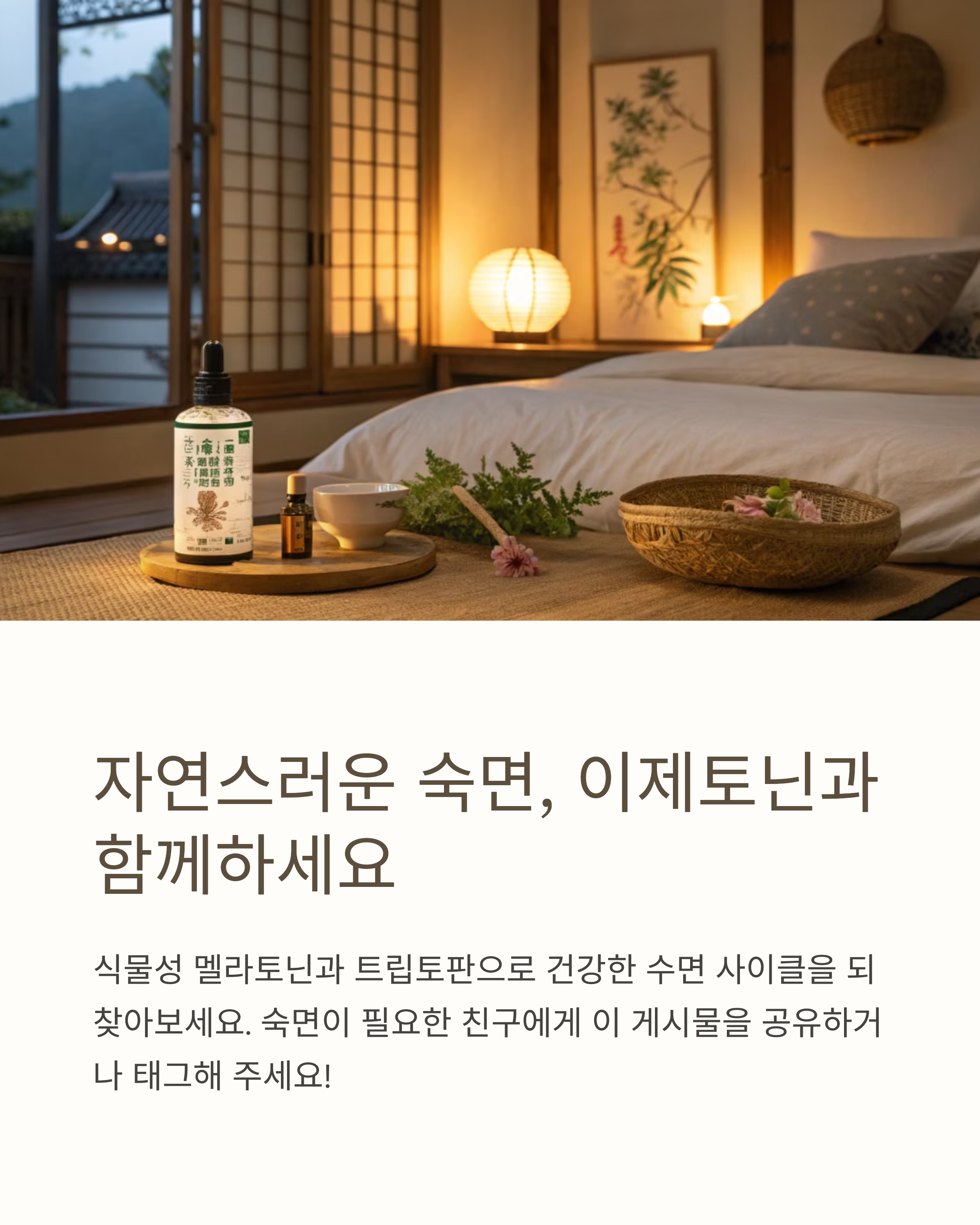 | 이제토닌 | 식물성 멜라토닌 2mg, 트립토판, B6 | 자연 유래, 부작용 적음, 무카페인 |
