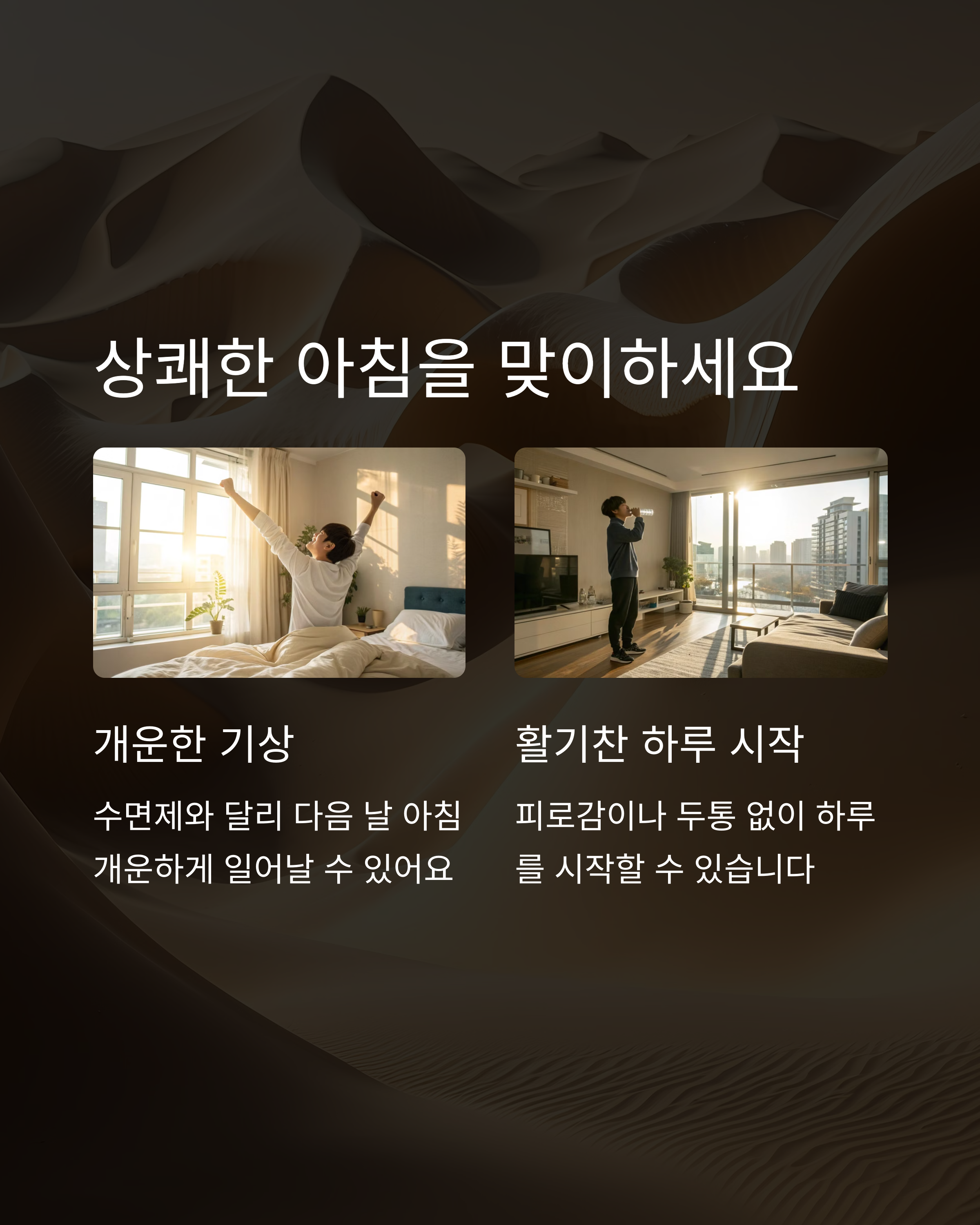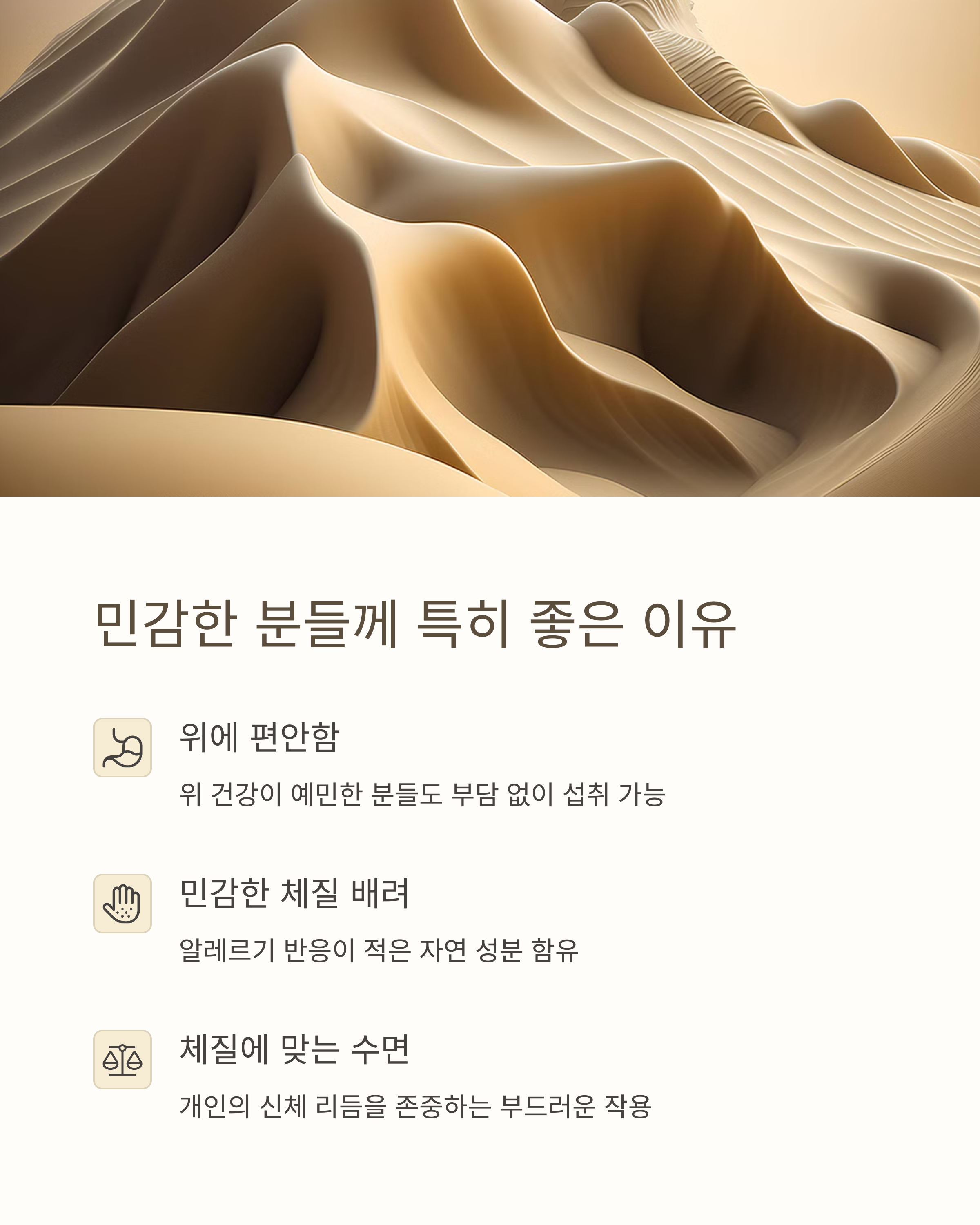 제가 실제로 섭취해본 결과, 확실히 자연스럽게 잠이 오는 느낌이 있었어요. 졸음을 억지로 유도하는 게 아니라, 마치 피곤할 때 스르르 잠드는 그 흐름이 생긴다고 할까요? 특히 다음날 아침에 머리가 맑았다는 점이 가장 인상적이었습니다.