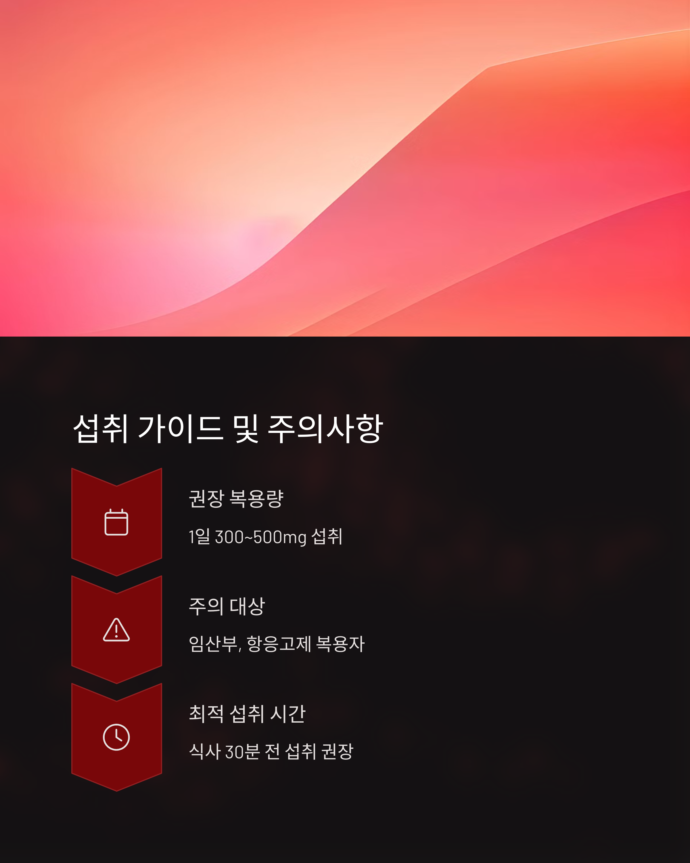 권장 섭취량 1일 300~500mg (건조 추출물 기준)