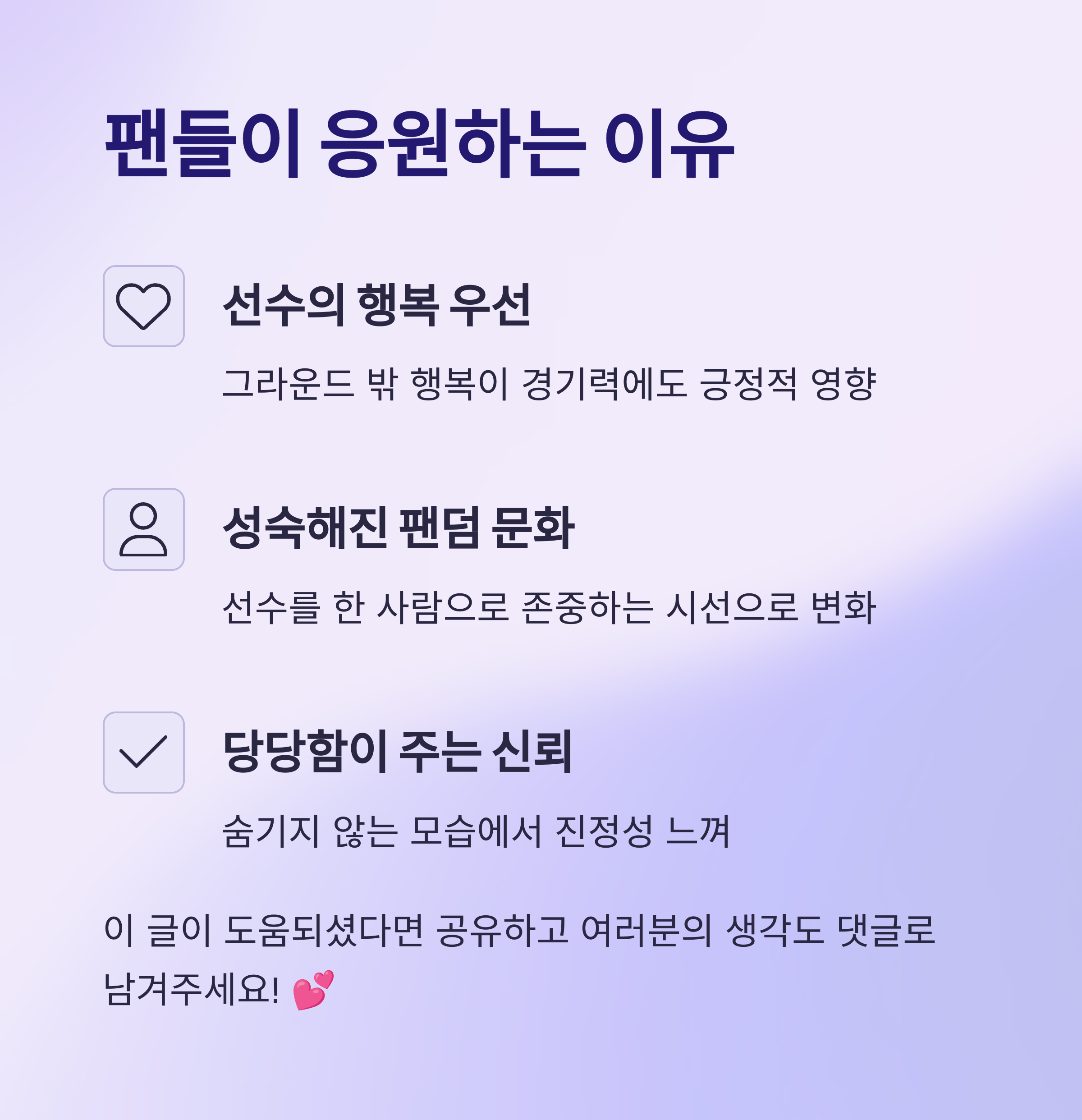 - 성숙한 팬덤 문화: 선수들의 사생활을 존중하고 행복을 응원하는 방향으로 팬덤 문화가 변화했습니다.