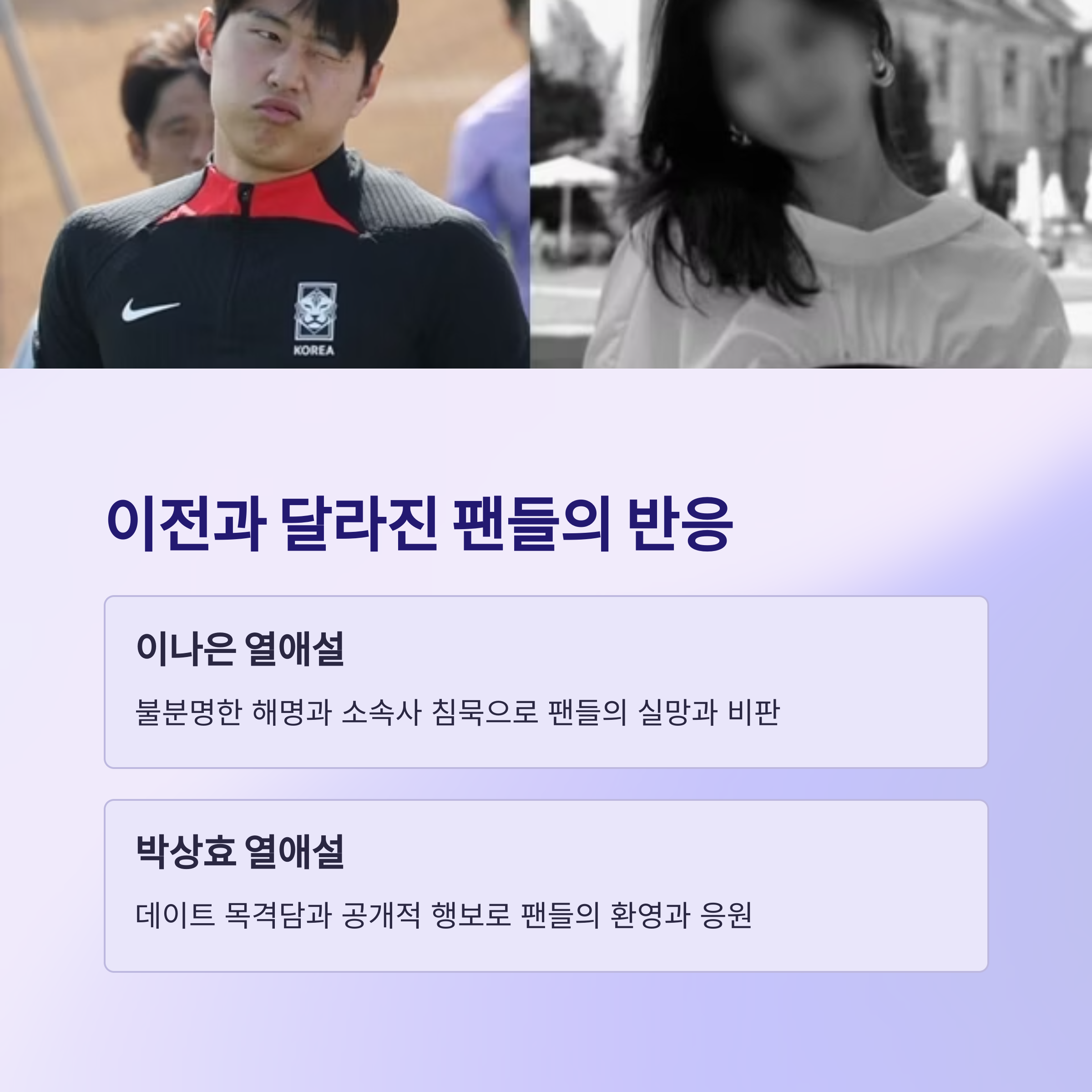 저는 이번 열애설에 대한 팬들의 폭발적인 응원을 보면서 몇 가지 이유를 생각해봤습니다. 뭐랄까, 팬들도 이제는 우리 선수들이 '일'만 하는 기계가 아니라, 한 명의 사람으로서 행복하게 사는 모습을 보고 싶어 하는 것 같아요.