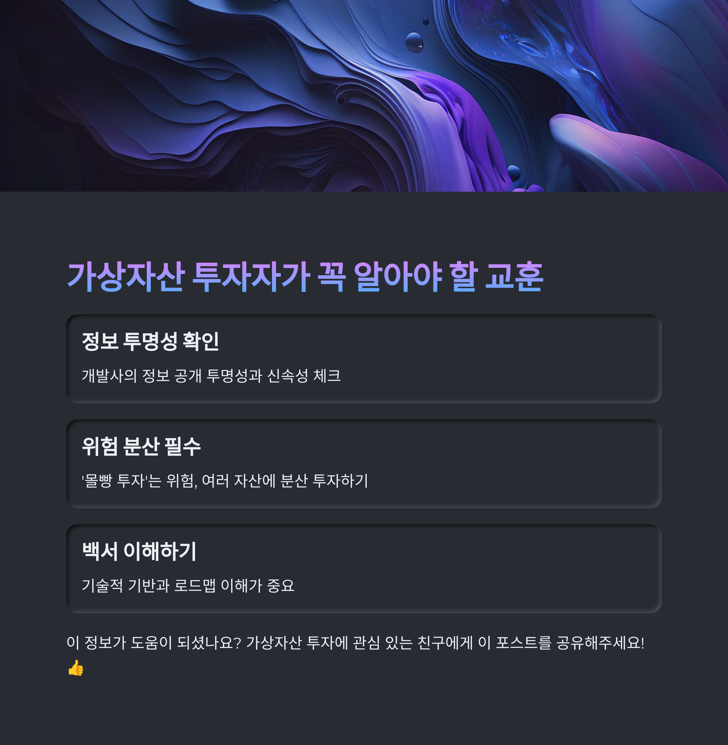 1. 정보의 투명성과 신속성 확인: 투자하려는 가상자산의 개발사가 정보를 얼마나 투명하고 신속하게 공개하는지 확인해야 합니다. 공식 커뮤니티나 공시 채널을 주기적으로 확인하는 습관이 중요해요.