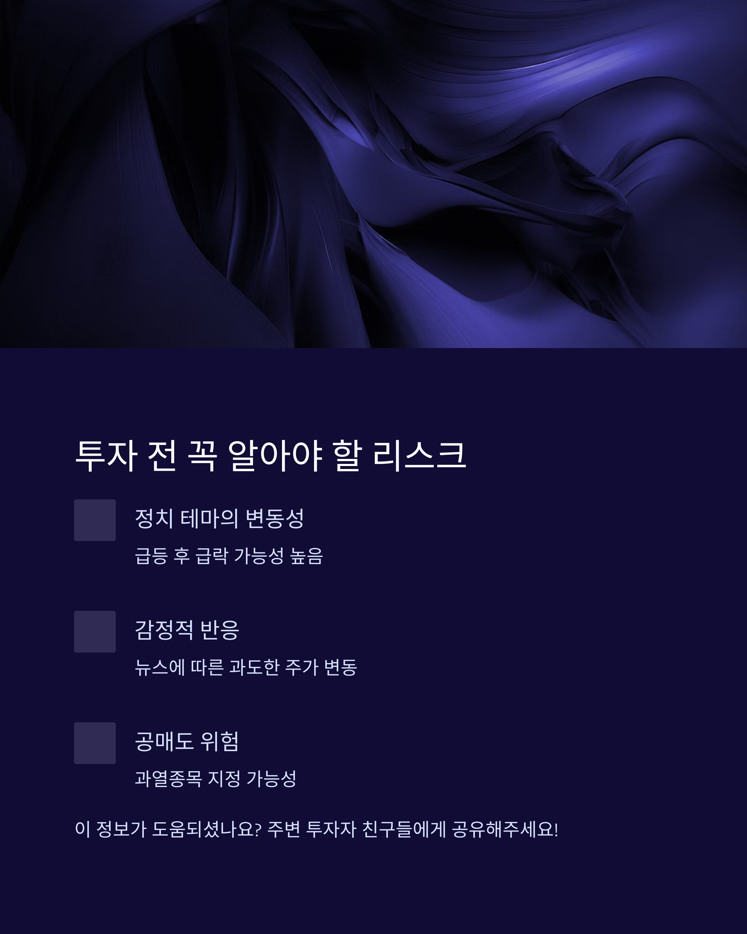 가장 큰 리스크는 정치 테마로 인한 변동성과 공매도 과열지정이에요. 따라서 분산투자와 손절매 기준 설정이 필수입니다.