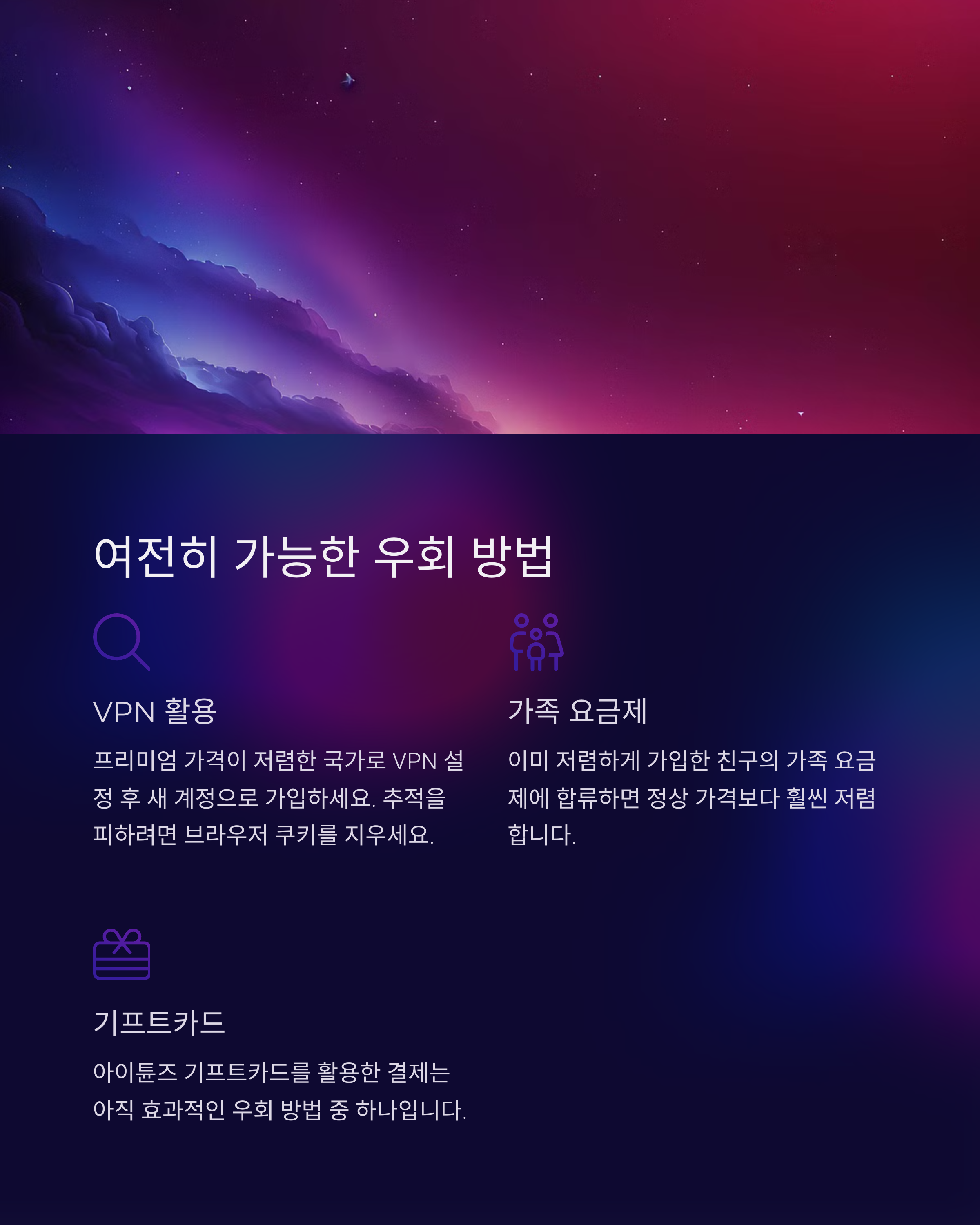 | VPN 사용 | 특정 국가의 서버를 통해 접속하여 결제 진행 | 보통 효과적이나, 일부 VPN은 차단됨 |