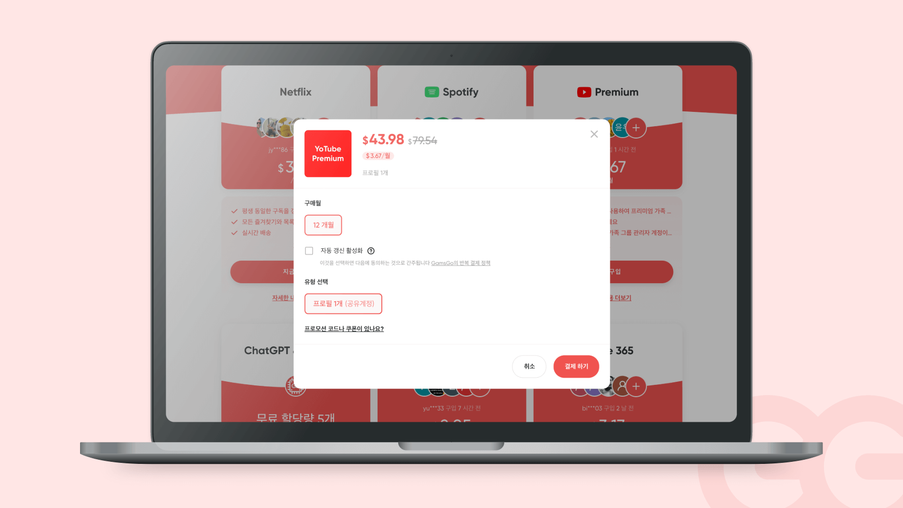이제 유튜브 프리미엄, 넷플릭스, ChatGPT까지! 더 이상 비싸게 구독할 필요가 없습니다. 겜스고 프로모션을 활용하면 더 저렴한 가격으로 구독 서비스를 이용할 수 있어요. 최신 할인 코드와 꿀팁을 놓치지 말고, 합리적인 가격으로 최고의 서비스를 즐겨보세요!