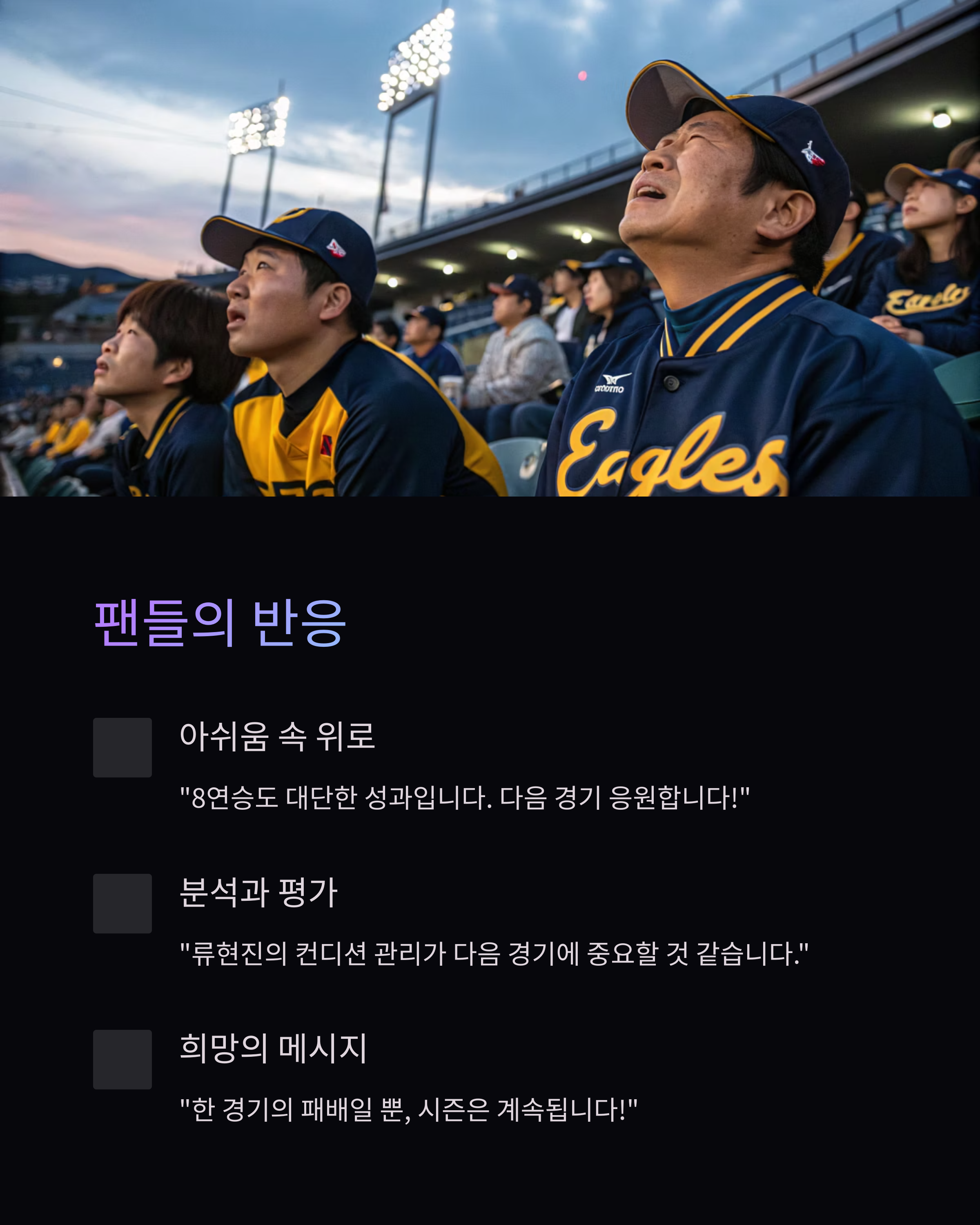 경기 종료 직후 한화 팬 커뮤니티는 아쉬움과 격려가 뒤섞인 반응을 보였습니다. 특히 “류현진도 사람이다”라며 응원하는 목소리도 있었고, 불펜 강화 필요성을 지적하는 의견도 많았습니다.