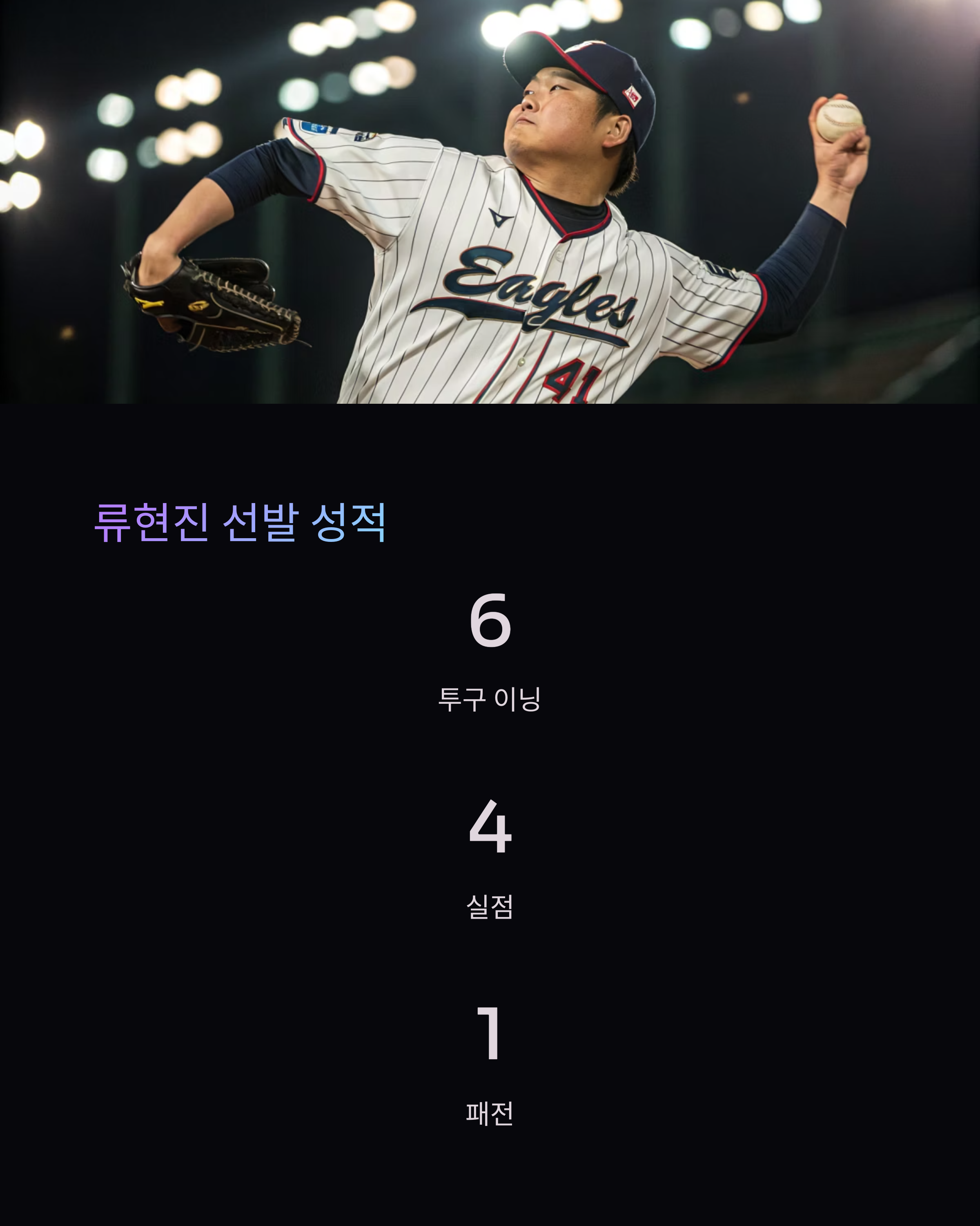 6이닝 4실점으로 부진했던 편입니다. 제구 난조와 변화구 실투가 장타로 연결되며 위기를 자초했습니다.